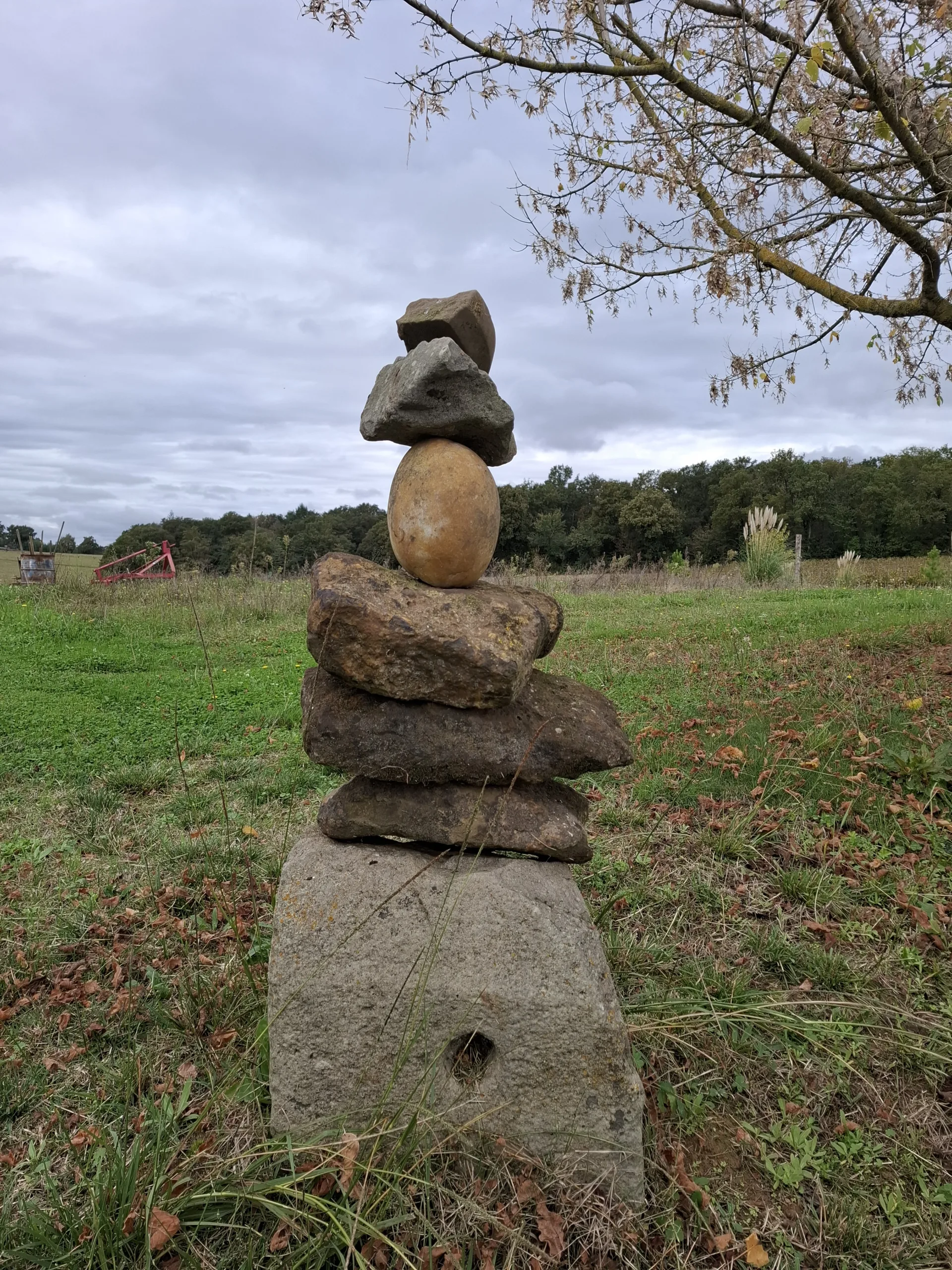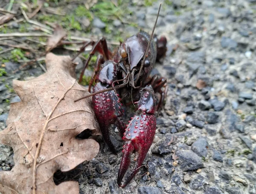 Poutníci přede mnou byli nějací žertéři. Nechávali za sebou kamenné panáčky z různých materiálů. Pak sejdu mezi rybníky. Cesta je naštěstí suchá, ale mezi listím leze rak! Vůbec jsme netušil že chodí na procházky z vody. Nebo že by ho z ní vytáhl nějaký lovec a on mu na poslední chvíli zdrhnul?