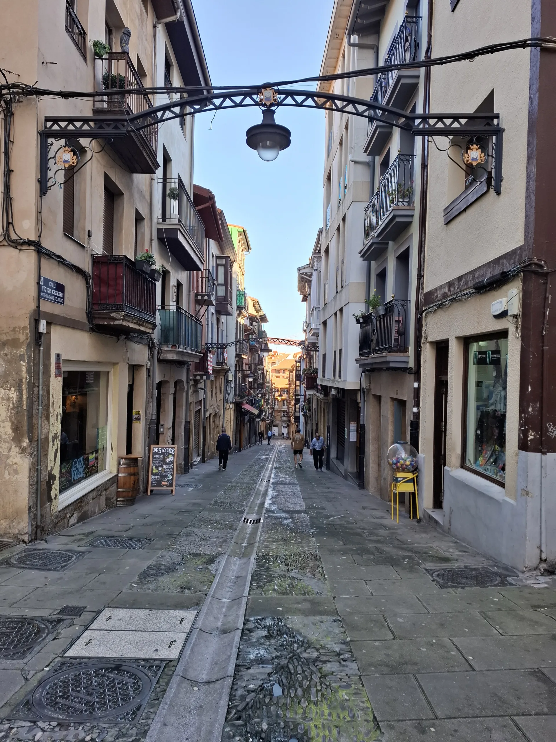 Bilbao je teď v neděli ráno jak po vymření. Po fiestě jen honí vítr po prázdných ulicích papíry a zbytky výzdoby. Nikde nikdo, ani auta. Opravdu slyším svoje kroky rozléhající se ulicemi. Strašidelnější než Día de los Muertos. Jdu po žlutých značkách Camina, jenže je to nějaké zmatené. Místo na mostě Puente Euskalduna vycházím nalevo od něj u řeky La Nervia.