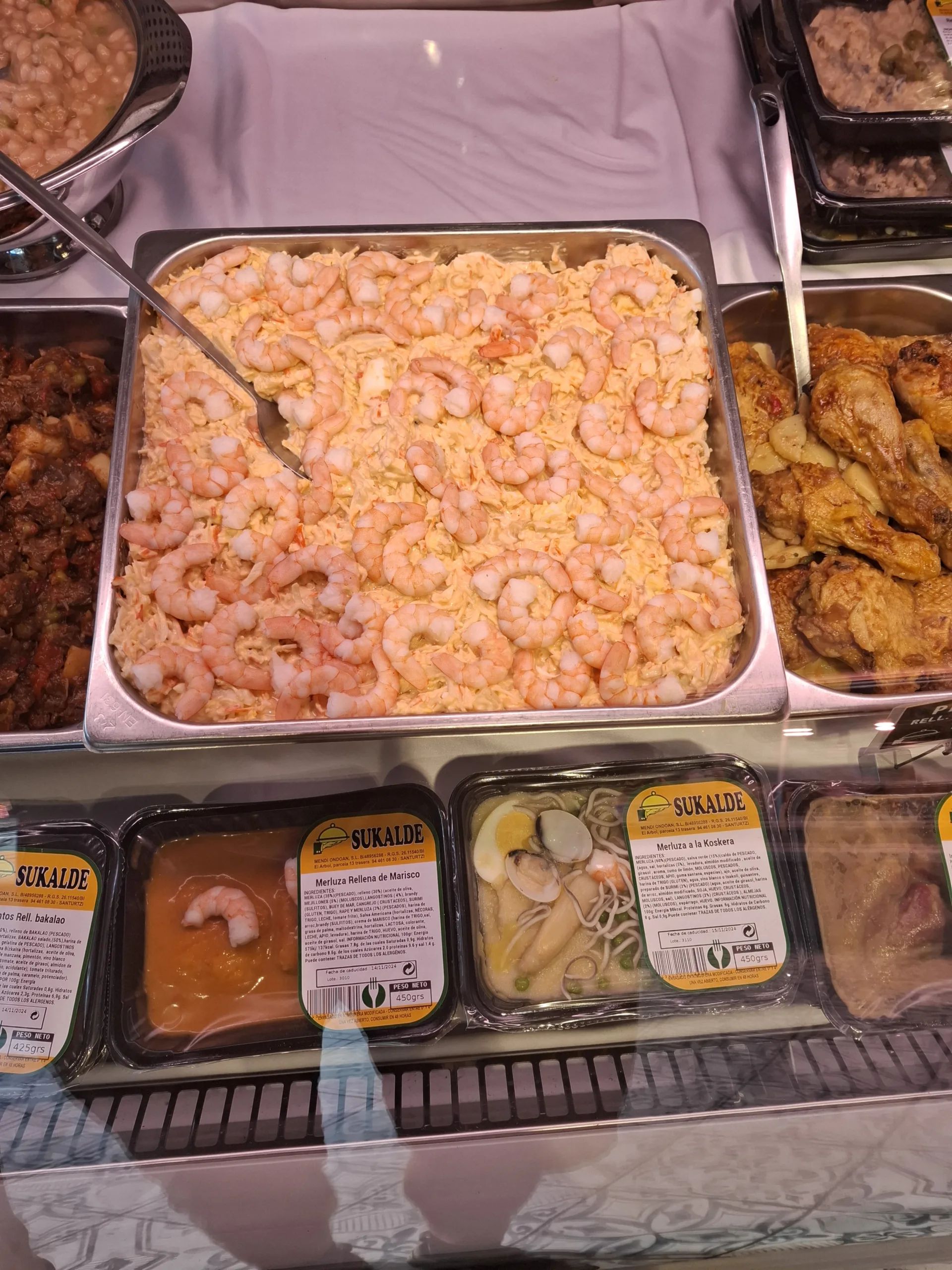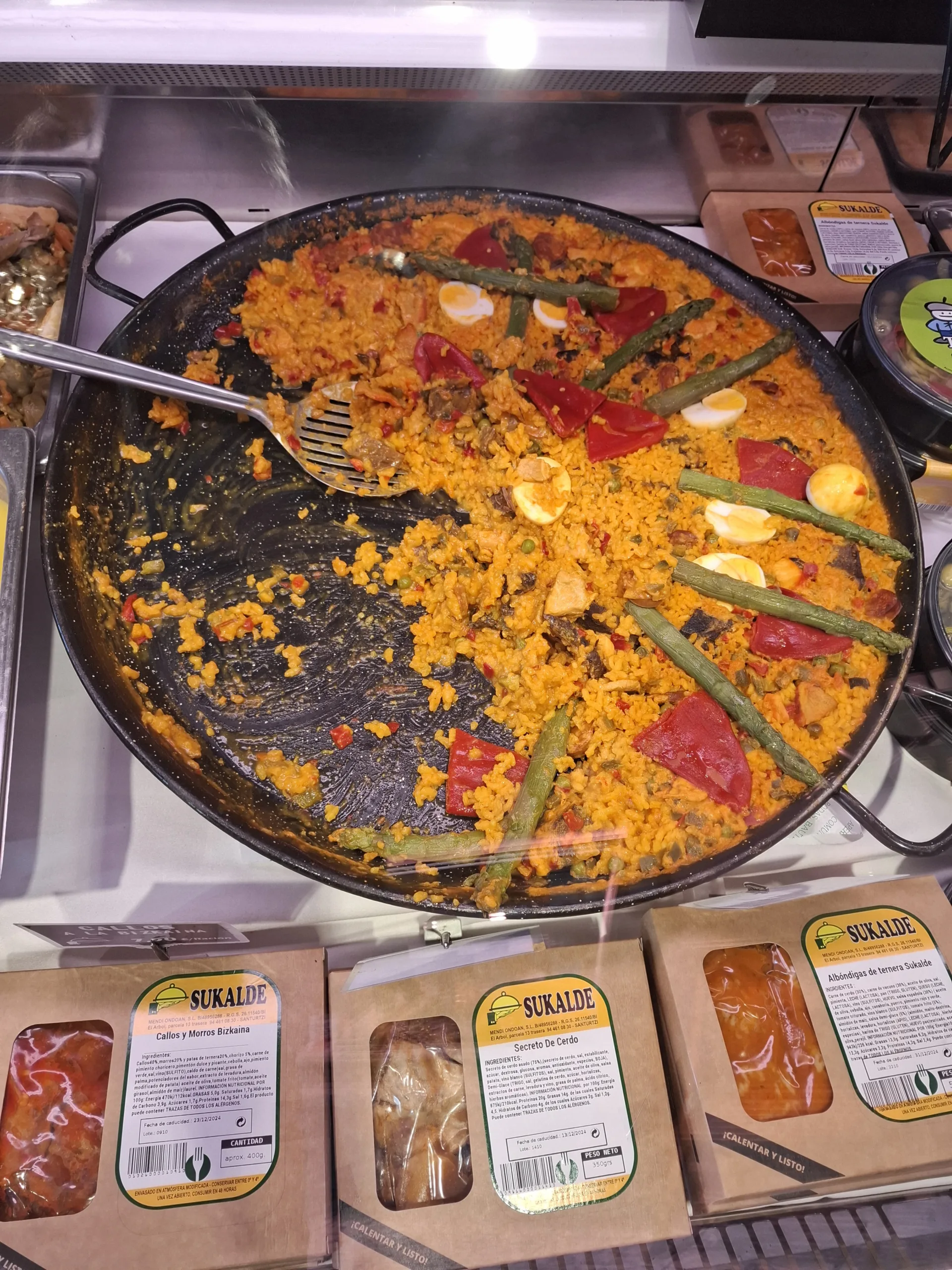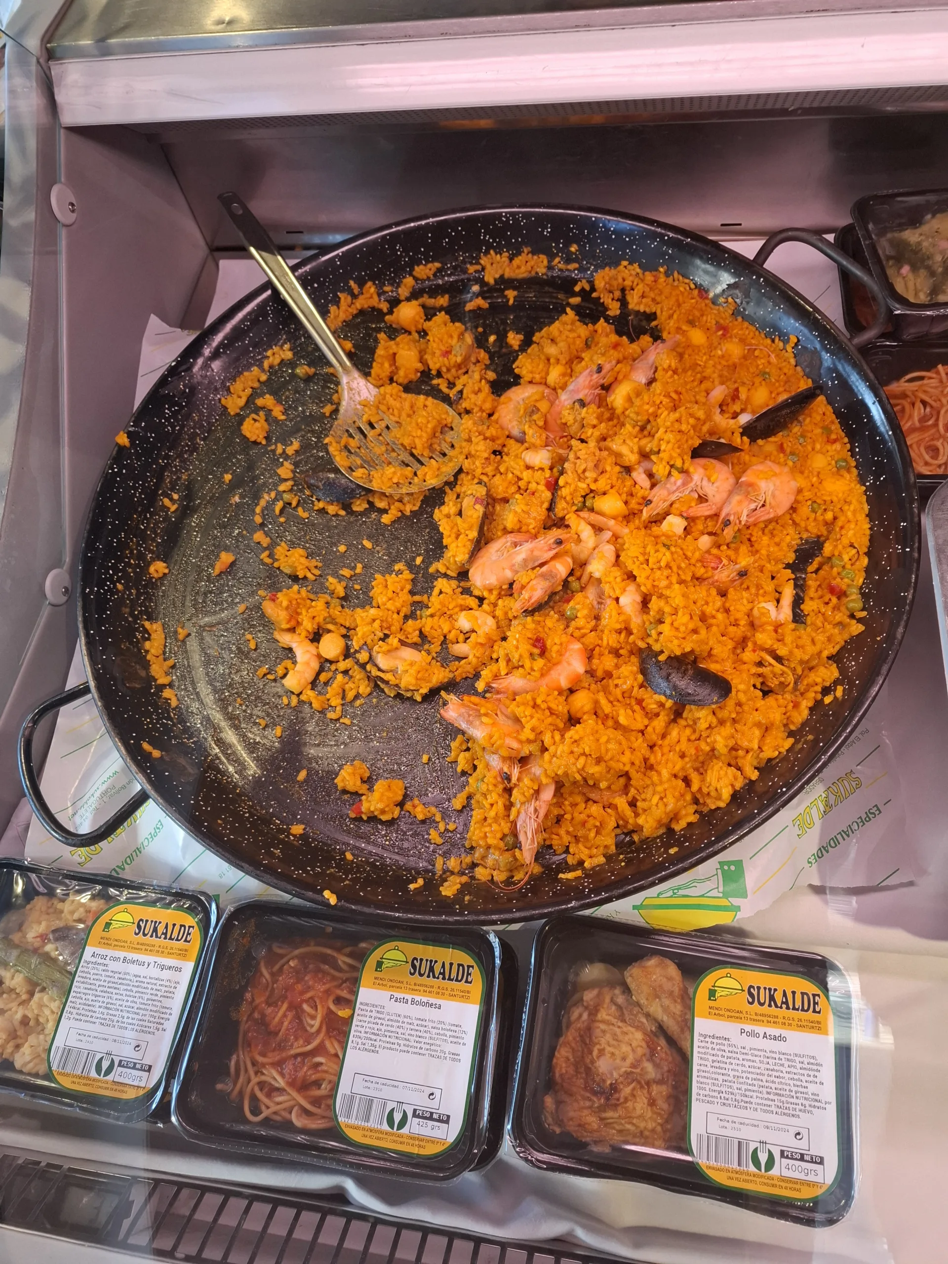 V rohu šišatého náměstí vlezu do řeznictví a dávám si zabalit vaničku paelly. Mají tu 3 druhy. K tomu hromady dalších masných lahůdek, ale zůstávám u té s mořskými plody. Když je moře na dohled, určitě budou čerstvé.