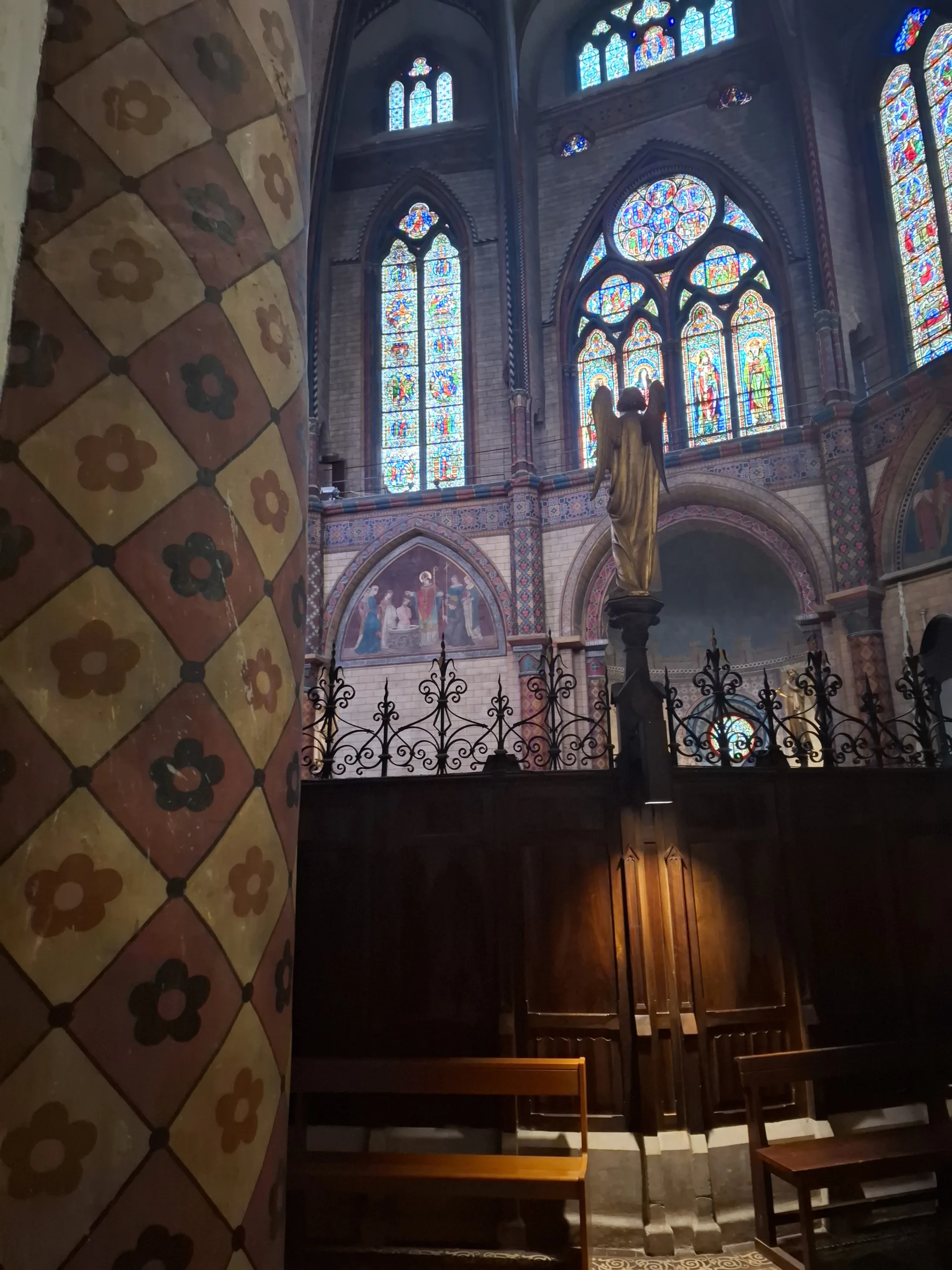Zvenčí mě zaujmou dvě velikánské černé leklé kupole. Jako by katedrála něco vystrkovala rovnou nahoru. Vypadá spíš jako pevnost než kostel. Zubaté hradby, úzká okna jako střílny.