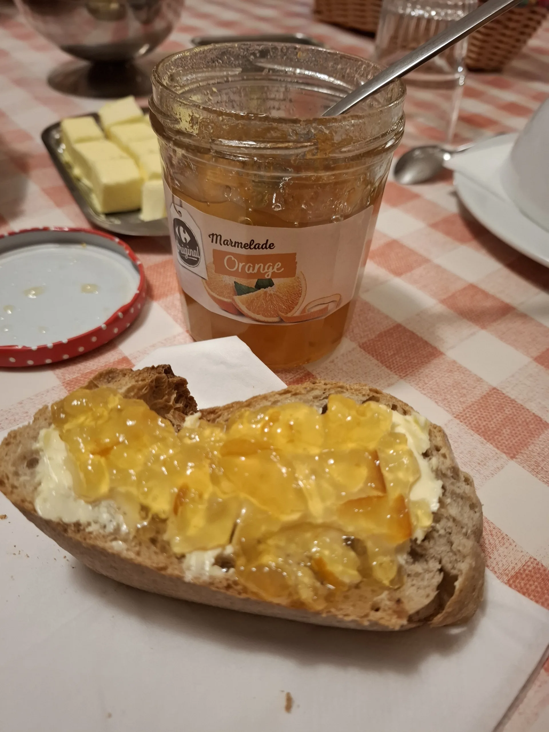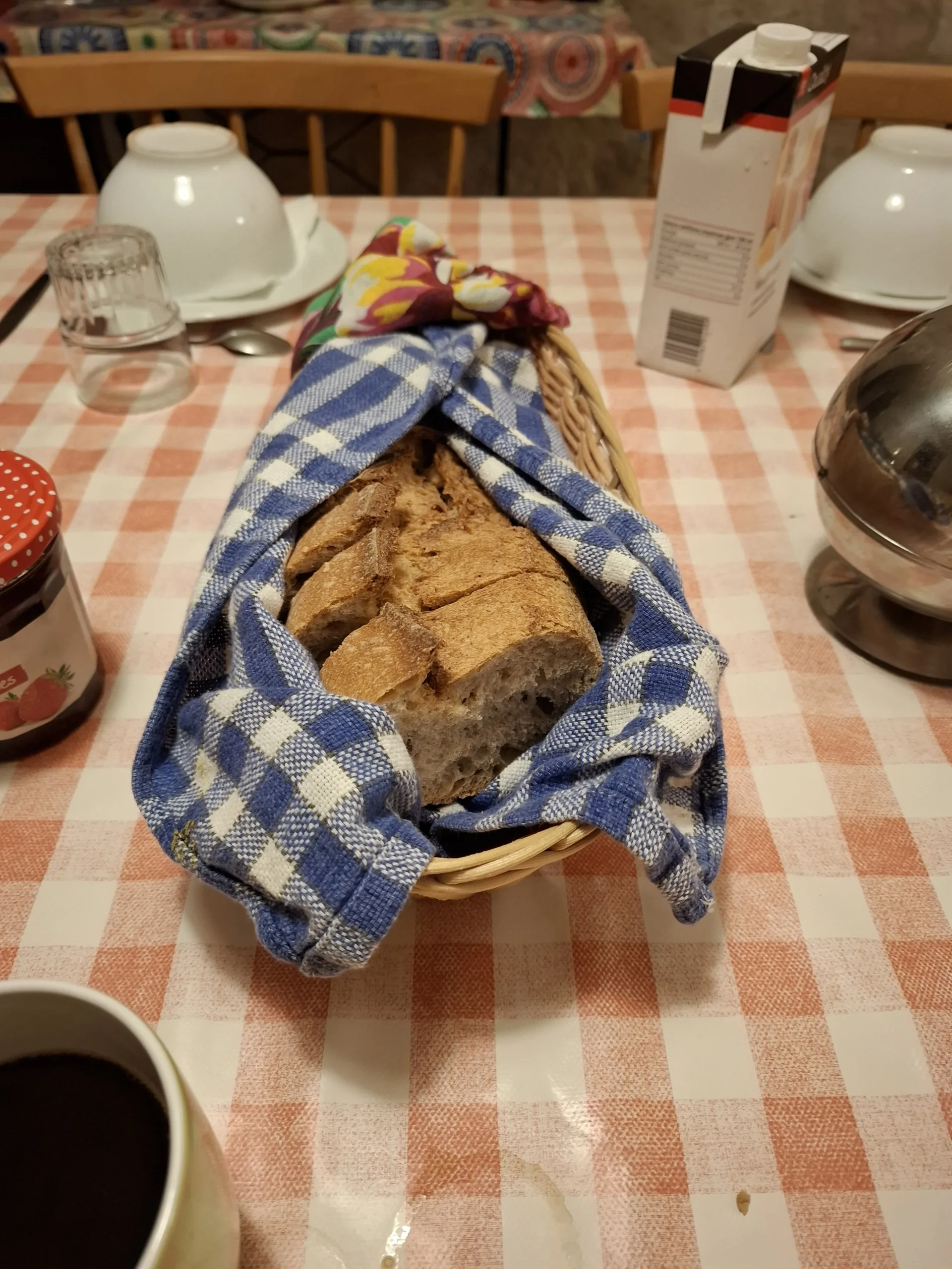Klášterní snídaně byla famózní. Michael mi po ní ještě nabalil „zbytky“ ke svačině -tak půlmetrovou patku chleba a pytlík máslíček, jamů a paštiček. Mají je v těch malinkatých baleních pro hotely, takže nejhorší je pak uklízet hromadu prázdných plastových krabiček. Nakonec jsme dali společné foto.