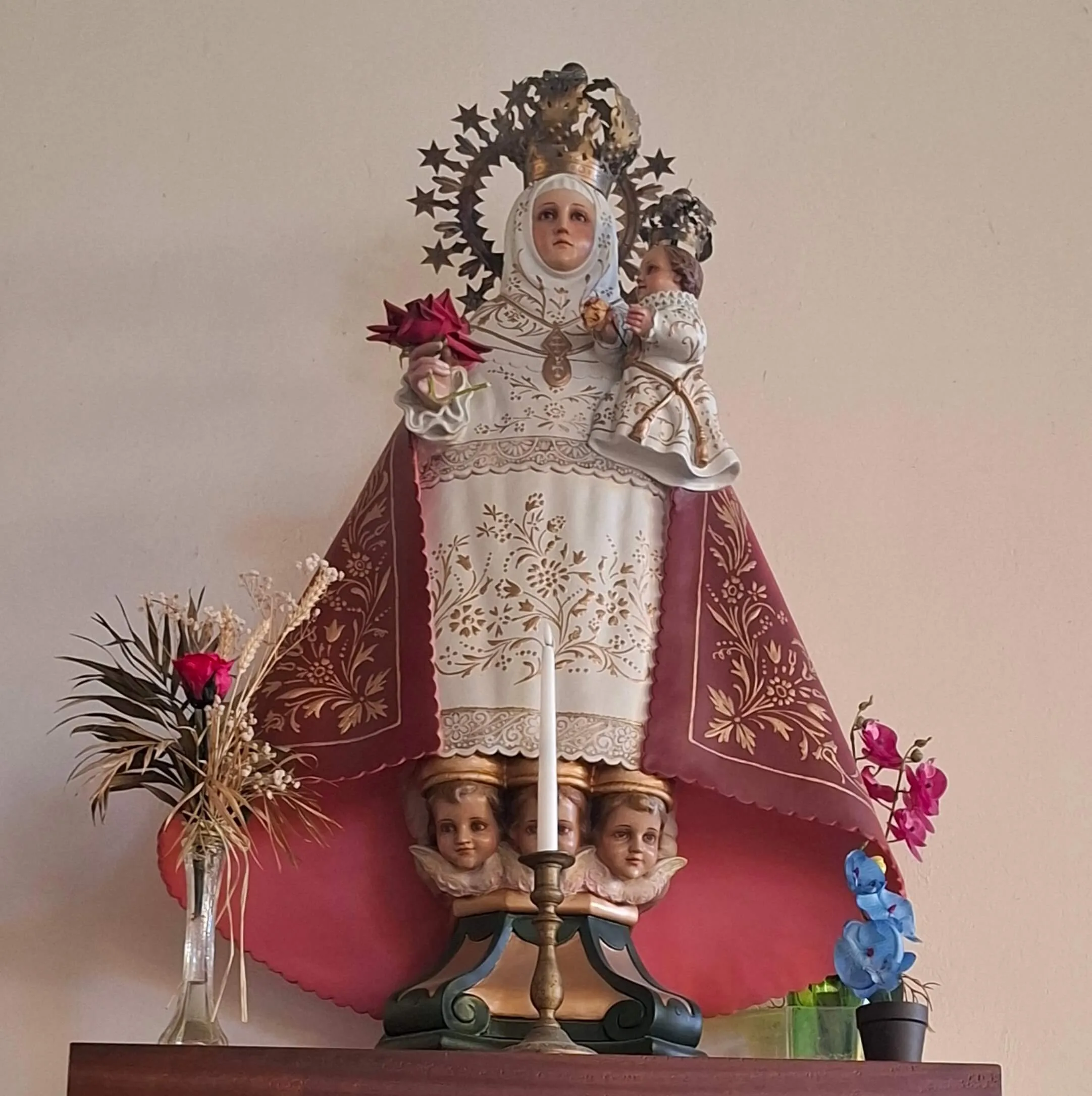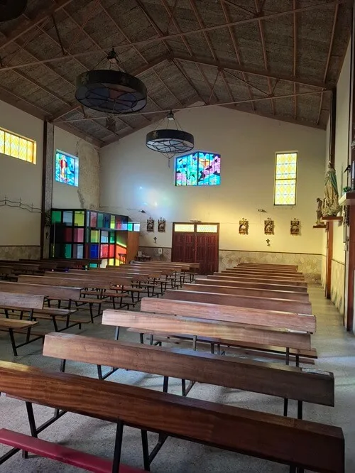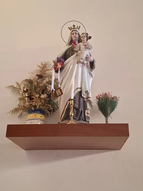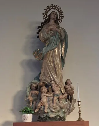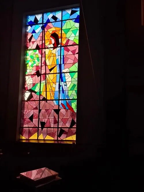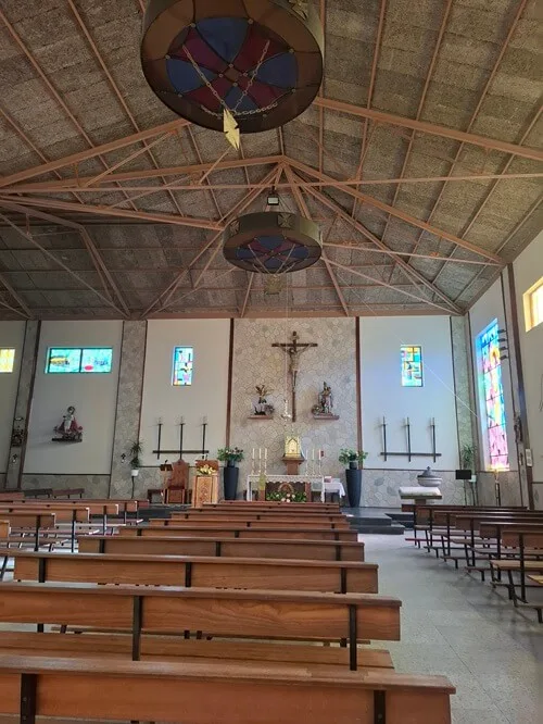 Tady krásně nakombinovali sochy a oltář ze starého kostela s novou stavbou. Nejvíc se mi líbí Panna Maria na hlavním oltáři. Jedno mrně chová a další dva naháčkové ji tahají za sukni. Laskavá maminka od dětí, která pomáhá i všem maminkám v širém okolí. Ukazuje jim, že nejsou samy, co se musejí starat o drobotinu. Jiné svaté zbožně hledící do nebe se čtyři andělíčci alespoň zamotali do šatů. Přitom všechno působí tak uklidňujícím dojmem, jako že pohoda a klídek. To patří k životu.