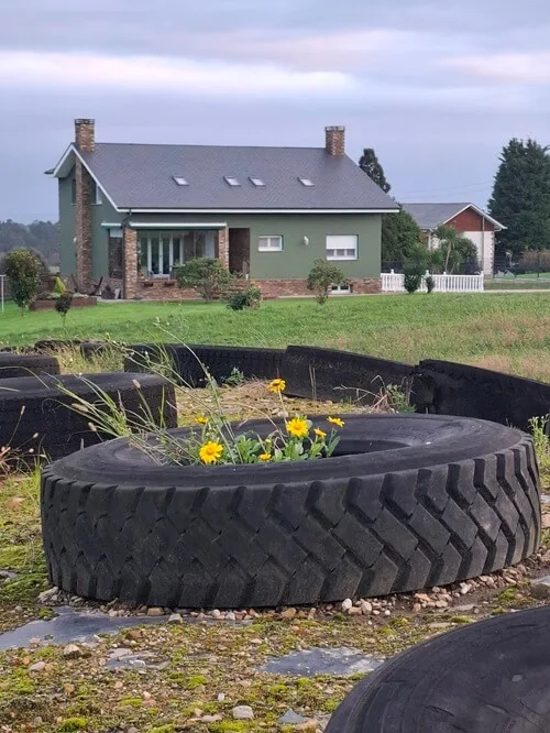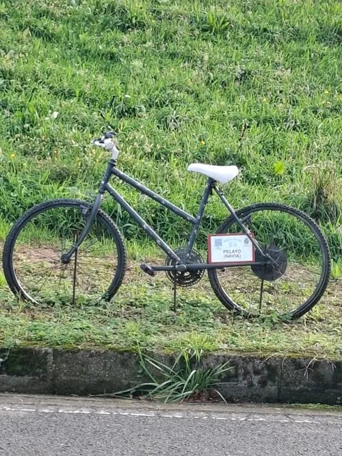 Za A Caridá jsem to omylem vzal po hlavní pořád rovně a za benzinkou po pravé straně stojí dámské kolo. Růžové. Za ním pánské zelené. Sakra co to je? Kolo za kolem, dětská, pánská dámská, skládačky. Jako když trousí děti v pohádce drobečky. Každé kolo je natřené jinou barvou a poctivě ukotvené do země. Lákají na návštěvu do vesničky Mernes! Večer jsem koukal na street view. Musí jich tam být kolem stovky, ale k jaké pamětihodnosti vedou, to jsem fakt nenašel. Některá na sobě mají cedulku se jménem vesnice -např. Pelayo. Že by každá ves v okolí věnovala jedno? Ale pro připoutání pozornosti dobrý, ušel jsme díky tomu 300 metrů navíc.