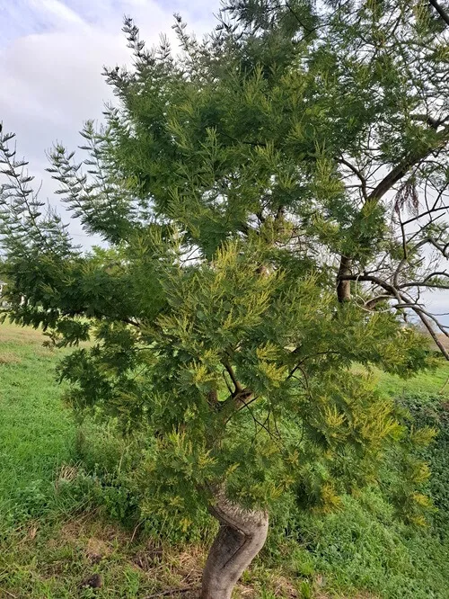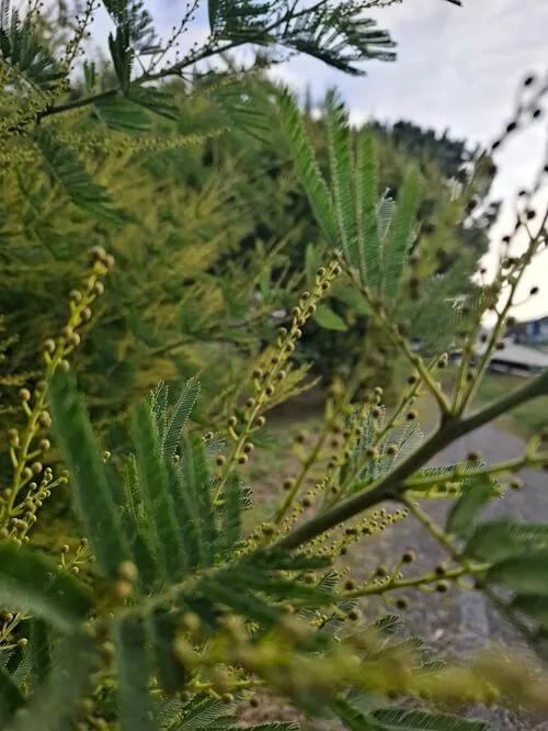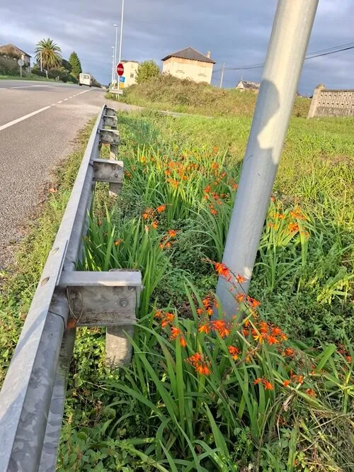Jediná péče, kterou tu dostanou je přejetí sekačkou. Stejně tak montbrécie. Příkop je jich plný. A tady zase zkroucené mimózy. O kousek dál kvetou nádherné kamélie. Jak procházka v botanické zahradě.
