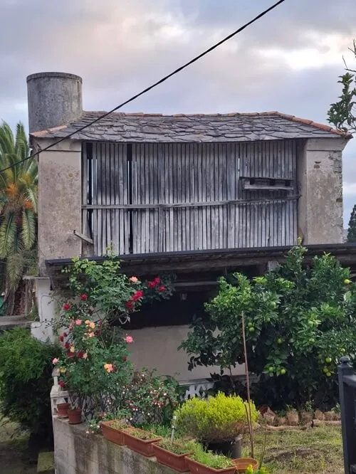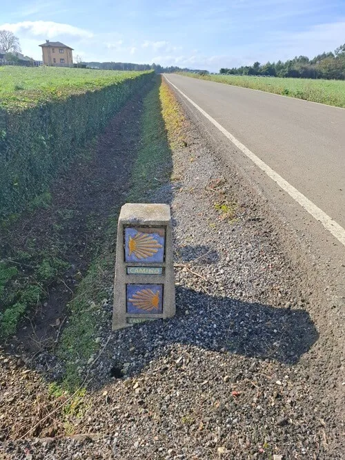 U cesty je i zvláštní kamenný patník se dvěma značkami. Vypadá jako hraniční, že by začínala Galície? Asi jo, protože sýpky u cesty jsou najednou podlouhlé a vyzdívané, tedy ne horreos, ale panereos.