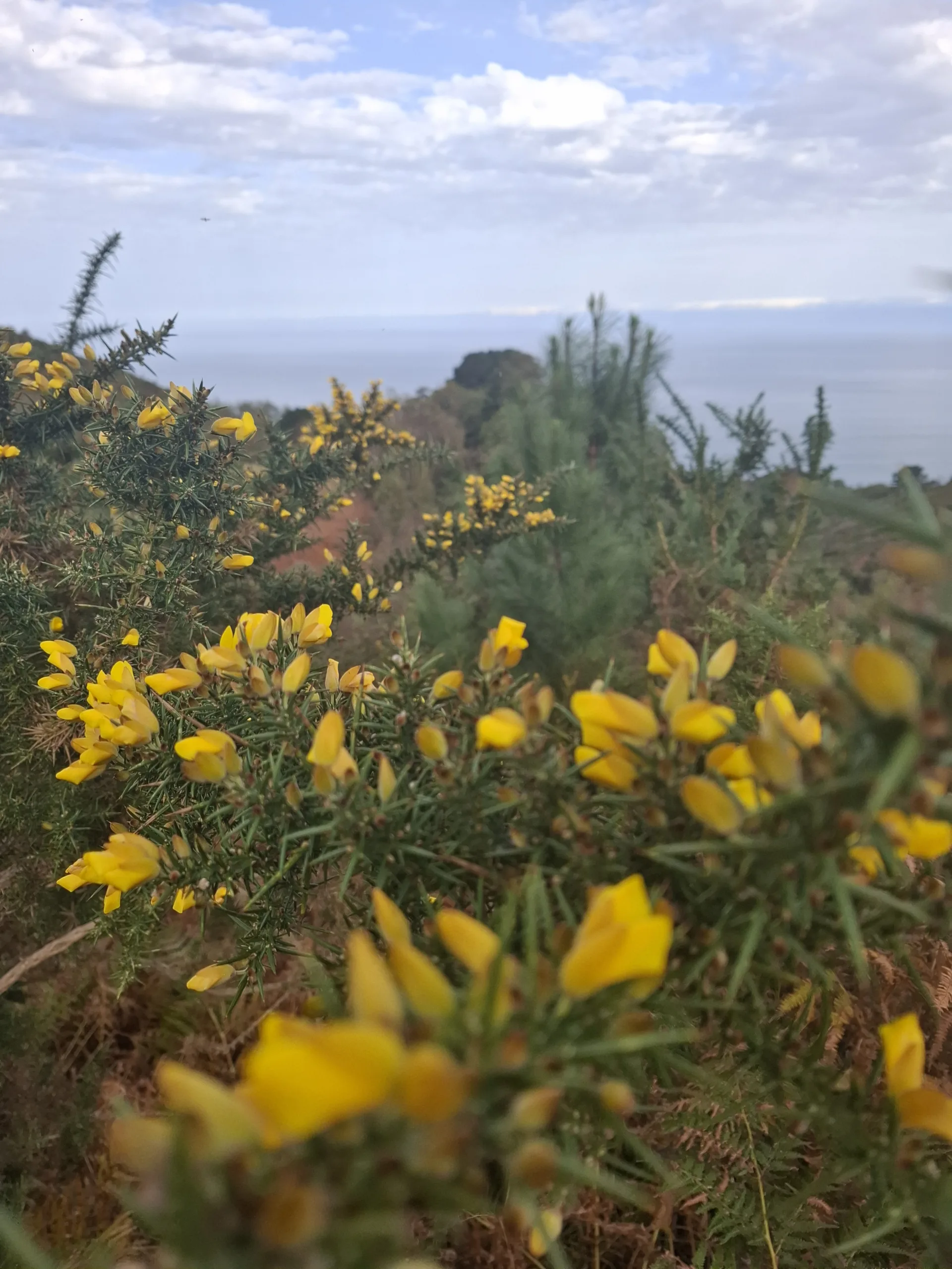 Doprava koukám na moře, doleva ze suché stráně. Cestu lemuje množství hlodašových keřů. Nechtěli byste do nich spadnout -jsou samý trn. Kvetou krásnými žlutými květy, celý sráz svítí jako pozlacený.
