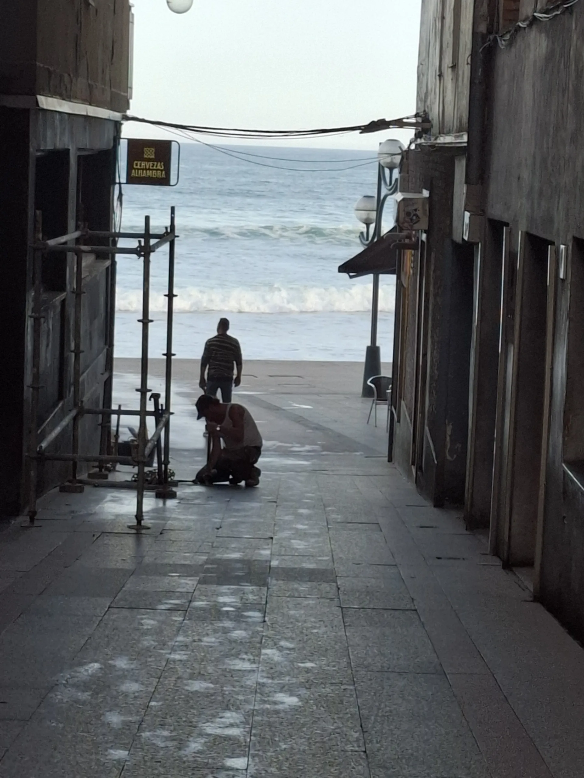 V osm hodin dostávám vytoužené razítko a po přímořské kolonádě se vracím do albergue pro baťoh. Oni promenádu myjí! Ne jenom kropicím autem, ale regulérně mycími vozy jako podlahu někde v nákupním centru kartáči a mycím prostředkem. Do toho se motají ranní běžci, kupodivu hlavně ženy. Done Quichote, ty to vidíš. A líbí se ti, co?