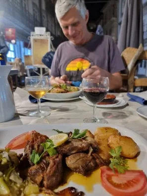 Pak talířek rissois – takové smažené půlměsíčky naplněné různými druhy masa. Koukáme kolem sebe, debužírujeme si a dobře se bavíme. A už přichází hlavní chod – pro Zuzku jehněčí s opečenými brambůrky a speciálním zeleninovým salátem, pro mě chobotnice se zeleninou. Ještě jsme nezažil, aby si nějaké jídlo tak vychutnávala. Dokonce si přitáhla probíhajícího hostinského jen aby mu ukázala jak je to výborné.