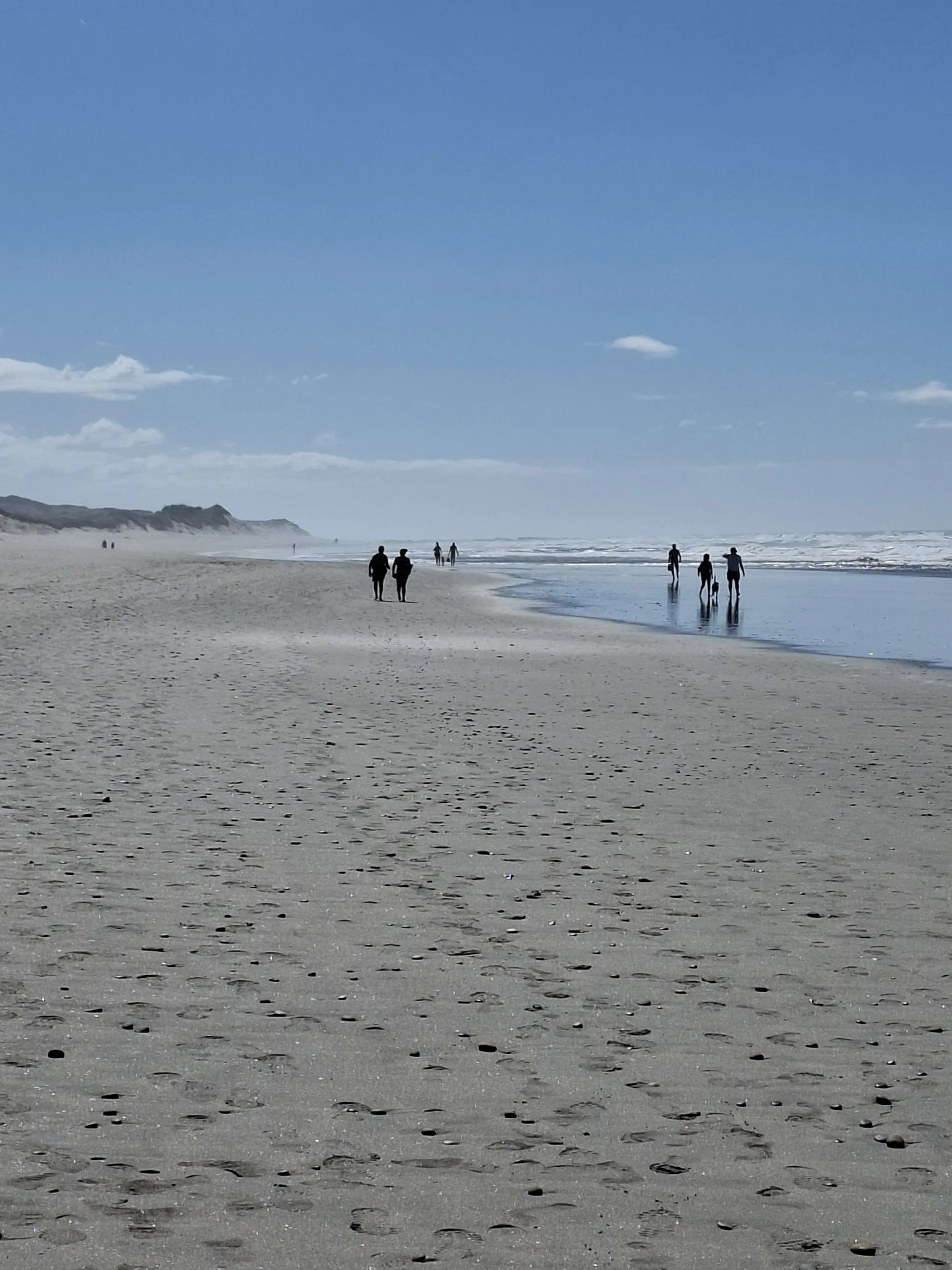 Od hospody vede užší cesta po vrcholech dun a po chvilce se ztrácí v písku. Seběhneme přímo na pláž. Tam kam vlny dosáhnou je tvrdší, takže zouvám boty a jdu naboso. Atlantik mi občas olízne kotníky. Do pěti čísel se voda ještě stihne ohřát a doběhne teplá. Nad 5 centimetrů už zastudí.