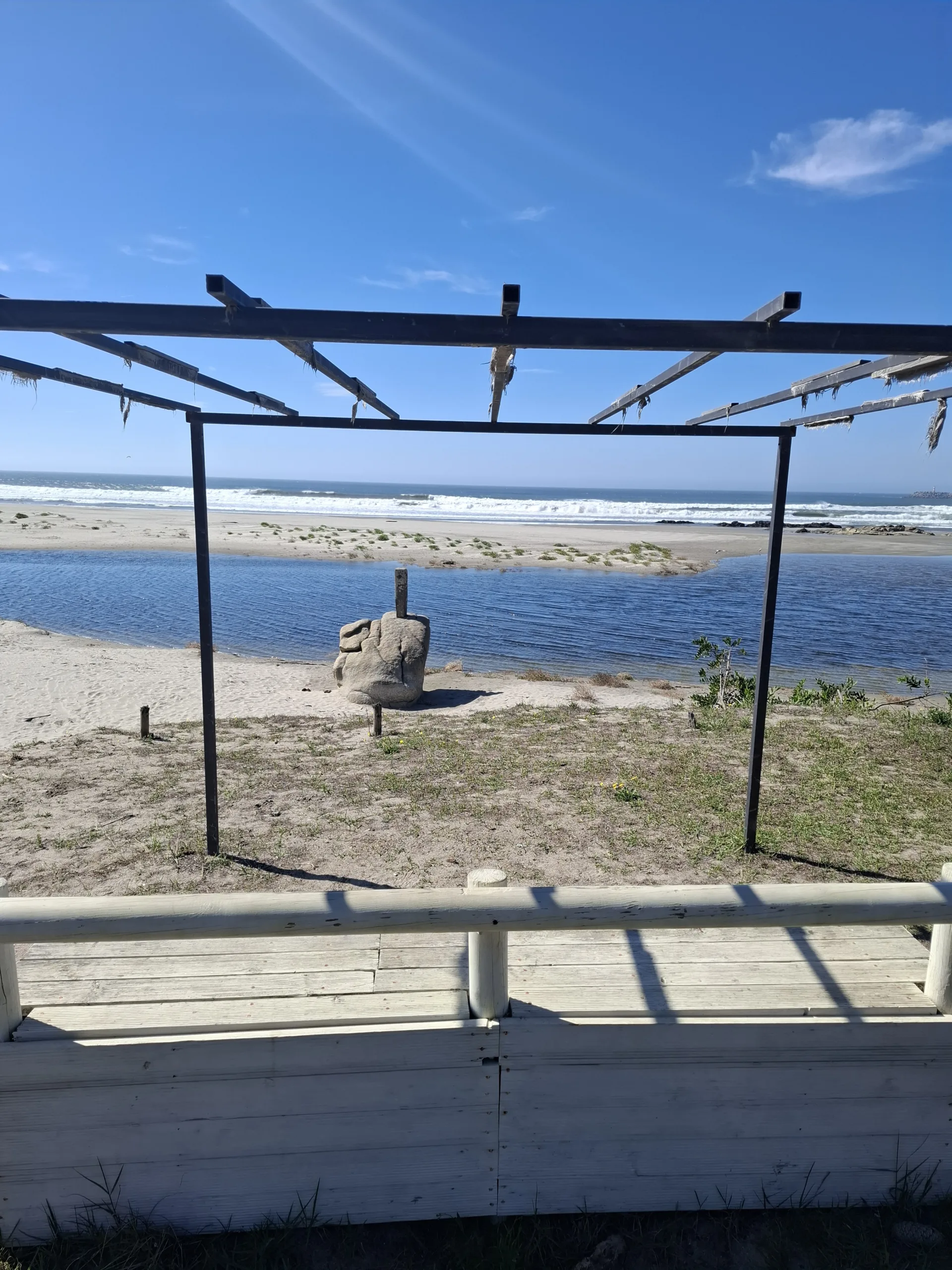 Takže musíme zahnout z pláže doprava a nějak trefit most přes Rio Lima. Měl by být tak 3 kilometry proti proudu. Kličkujeme předměstím, pak průmyslová zóna, kde vyrábějí pražce . Výrazný zápach karbolky a dehtu nám žene slzy do očí. Kdo si tu koupí dům s výhledem na moře, ten se tedy má.