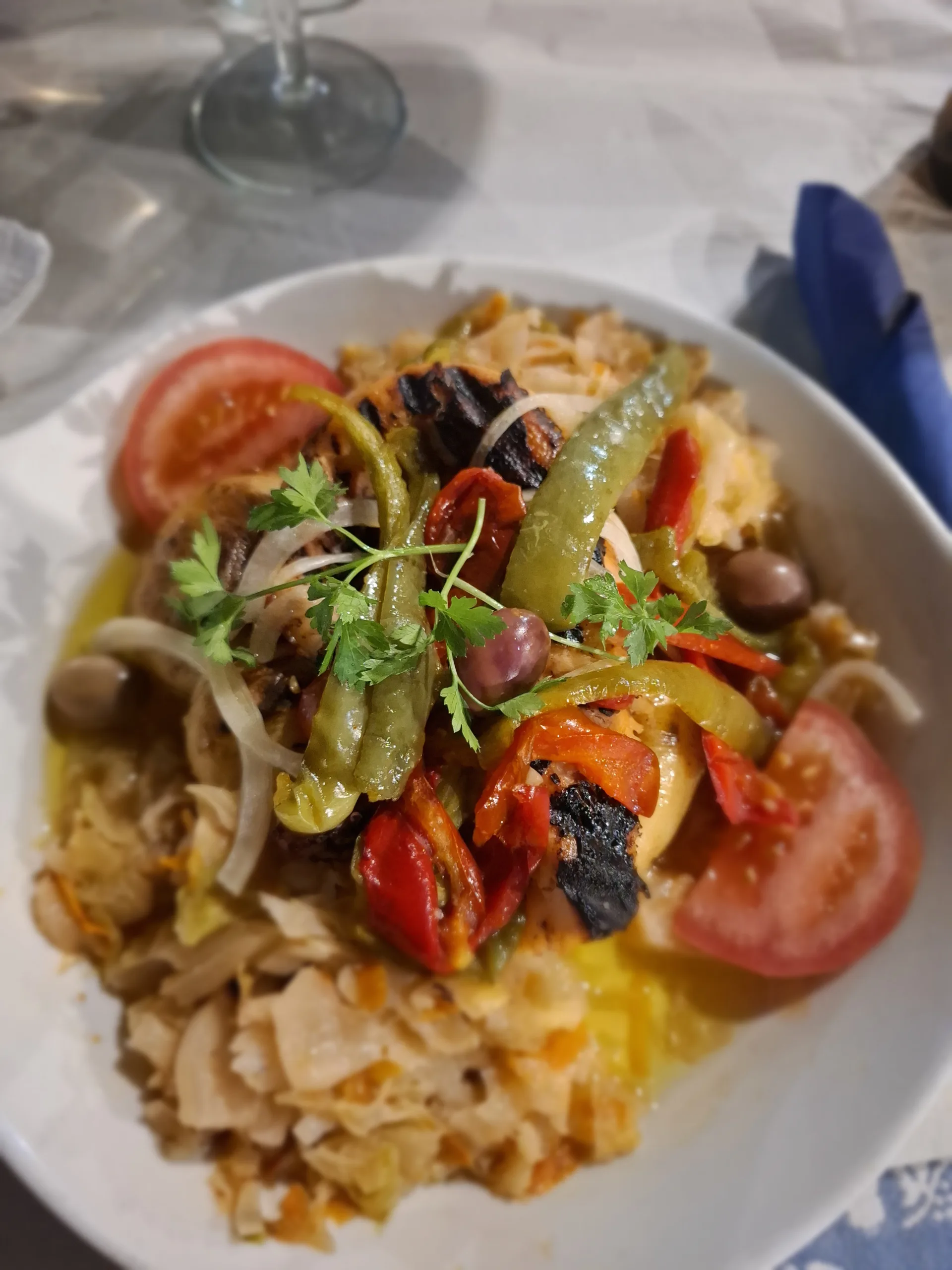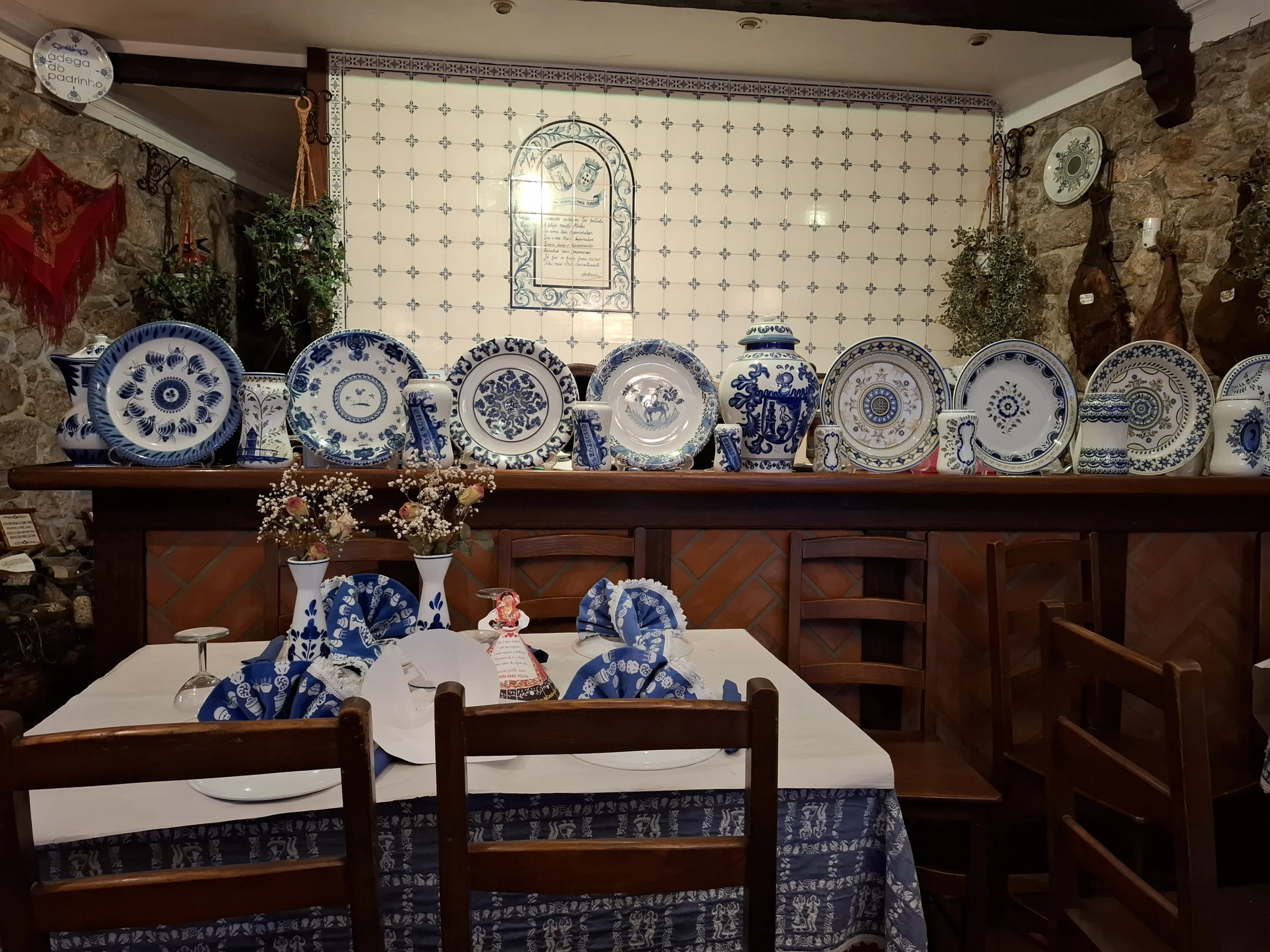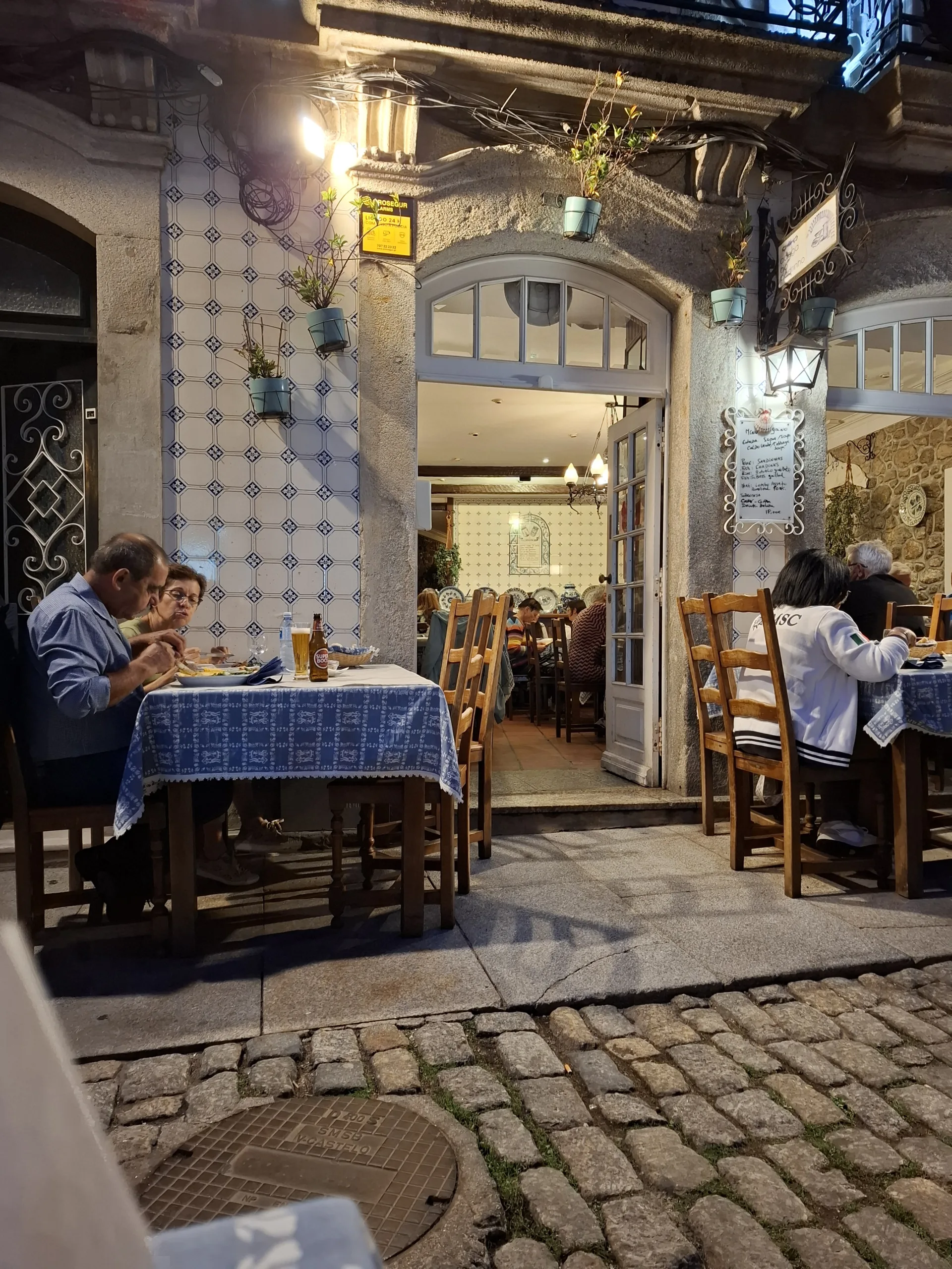 Couráme městečkem, obdivujeme nádherné domy a hledáme kde se najíst. U nábřeží v jedné hospůdce mají vystavené nádherné modrobílé malované talíře. Jdu si je vyfotit a šikovná hospodská nás hned usazuje, přestože mají skoro plno. Obsluhuje ještě s manželem a oba kmitají jak na drátkách. Přesto se na jídlo docela čeká. Ale jsou tu hlavně místní, takže musí vařit dobře. Necháváme si poradit.