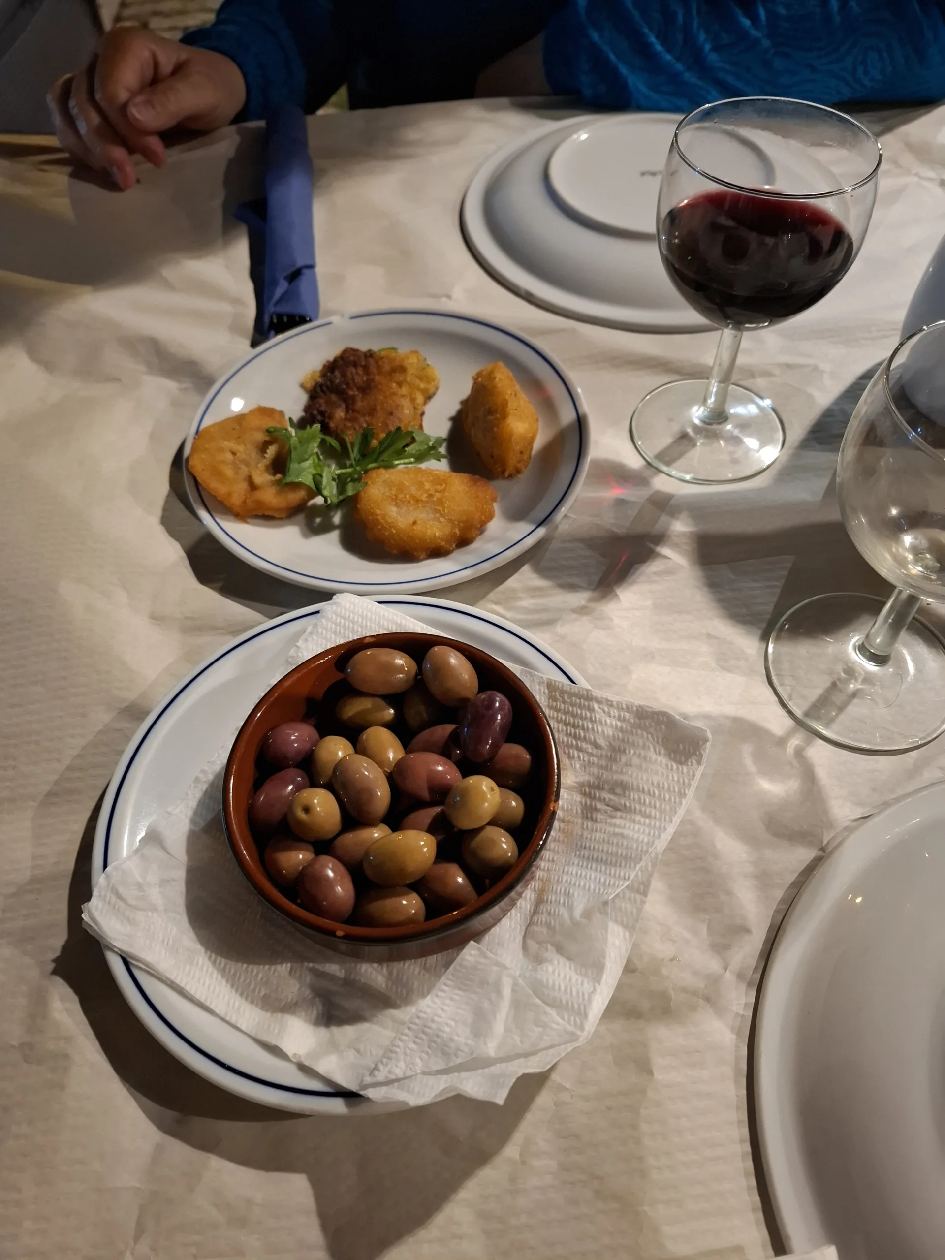 Nejdřív pro mě nealko pivčo a pro Zuzku džbánek červeného. Voní úžasně, ani stopa po siřičitanech, jen plná hutná vůně, trošku do černého rybízu, jestli to mohu posoudit. K tomu miska nakládaných oliv a nakrájená čerstvá bageta.