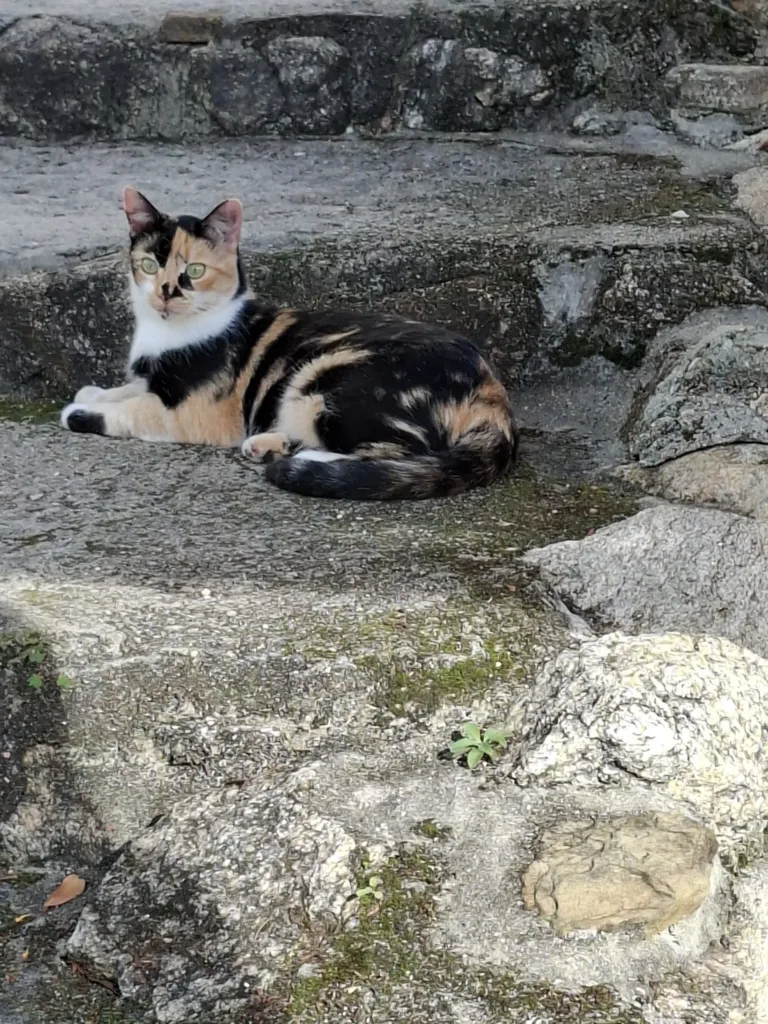 Po návratu na nás čeká hlavní hvězda večera – tříbarevná kočka Terinka. Na mazlení moc není, ale vyhrála si s námi tak, že skoro padáme na ústa. Nejdřív klasická schovávaná za zíďkou. Jak tam nastrčíme ruku, hned po ní tlapkou klepne. Umí to i bez drápků. Pak provázkovaná a nakonec jí hážeme kamínky přes trávník. Ty chytá s neuvěřitelnou bravurou. Tlapkama si je přihrává po trávě i hladkém betonu a divoce je fixuje pohledem, jestli si něco nedovolí. To není kočka, ale tři kila atomové energie ve flekatém kožíšku.