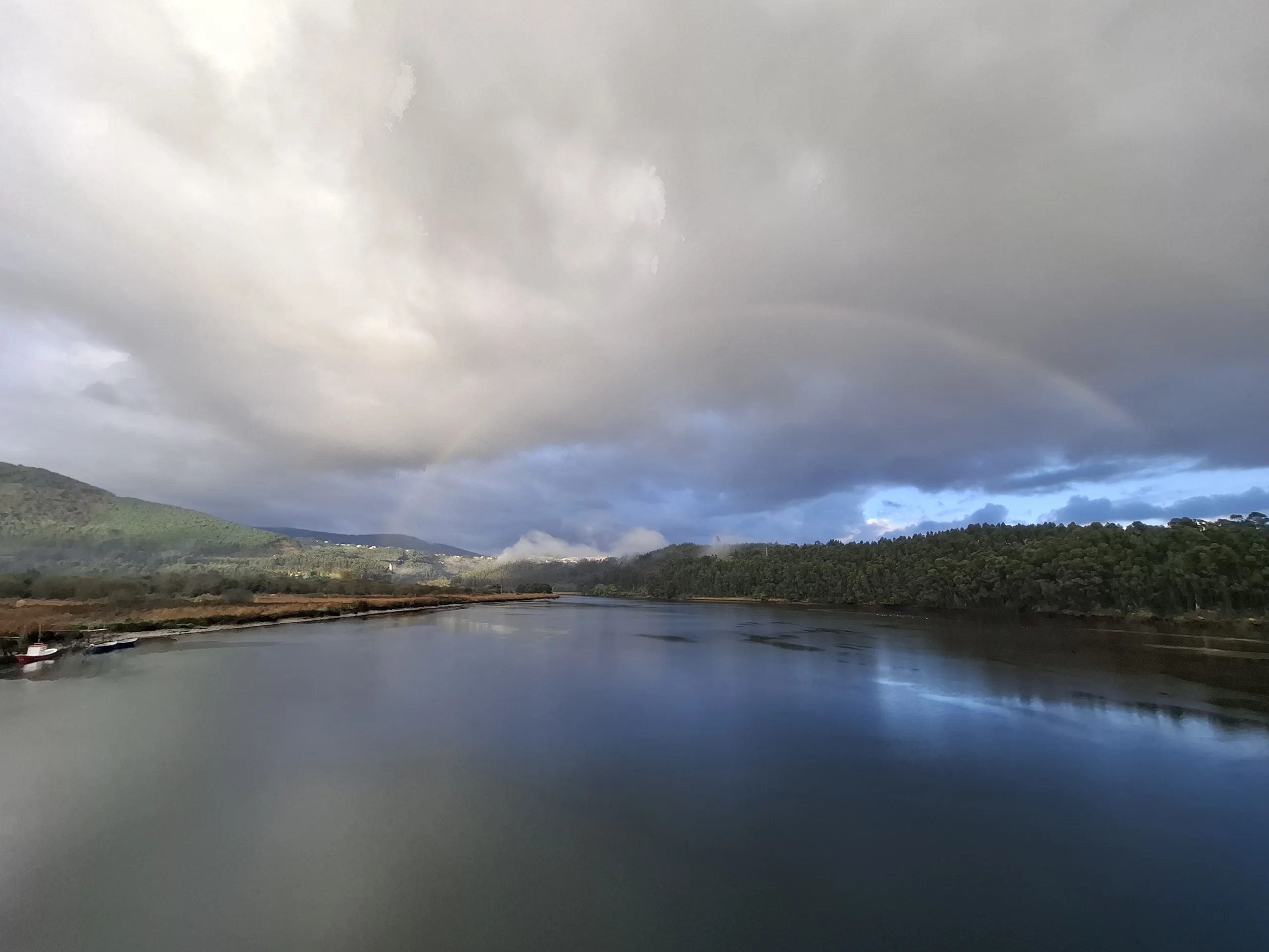 Rozloučíme se a sestupuji po silnici k mostu přes říčku Nalón. Mraky už se začínají trhat a nad vodou se udělala krásná duha.