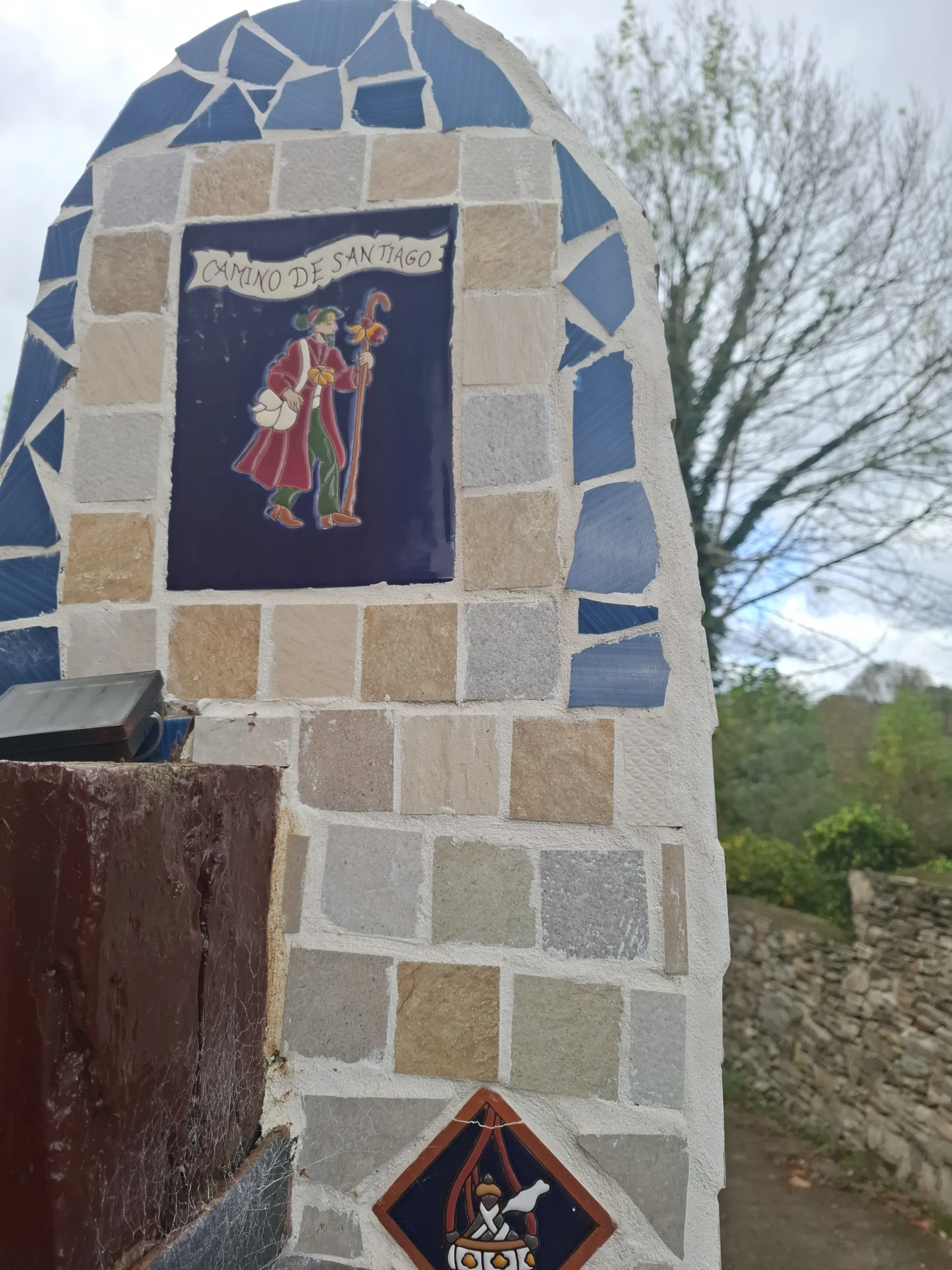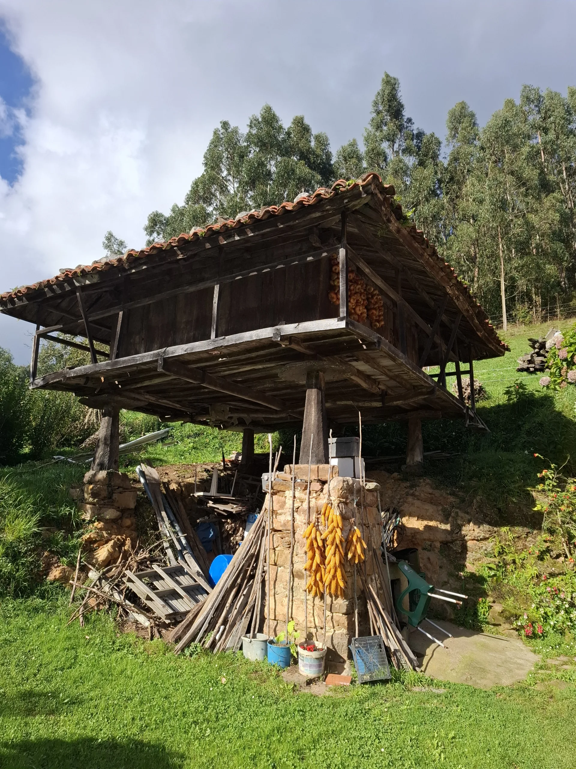 Kousek za náměstím míjím v parku lavičky se stolem schované pod novou horreos -sýpkou. Krásně vyřezávaná dvířka nejsou zamčená. Tady by se dalo přespat, pokud se tedy nocležník dokáže vyškrábat nahoru.