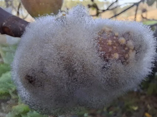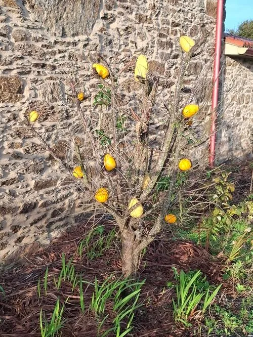 U baráku za nimi roste strom skoro bez listí a na něm velké žluté bradavičnaté citrony nebo co to je? Místní květena mi pořád připravuje nová překvapení.
