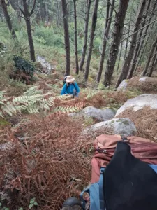 Vycházíme do ranního šera. Pomalu stoupáme přes vesničky údolím říčky Viladesuso. Jakmile ji po malé lávce překročíme, není cesty zpět. Asfalt se změnil ve štěrk, pak velkými kameny vydlážděnou lesní cestu. Děti z vesniček tu mají něco jako lesní školku. Okolní stromy a keře jsou označené cedulkami se jmény, samozřejmě ve španělštině.