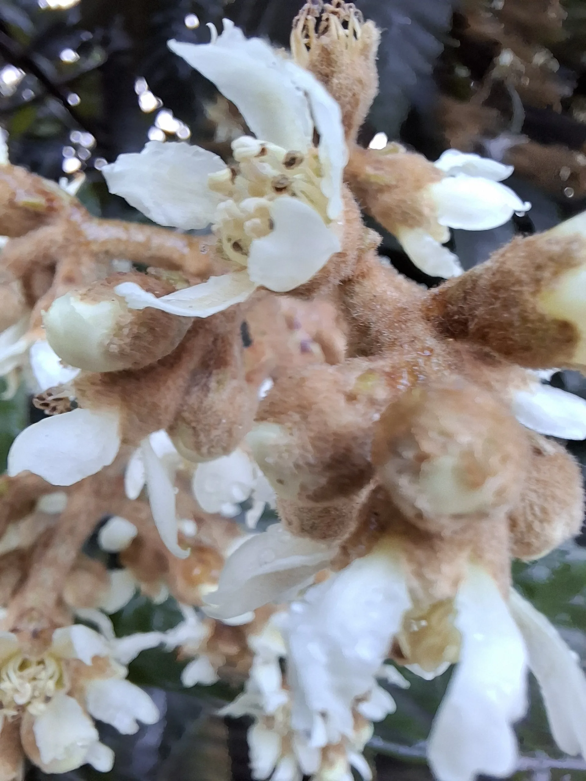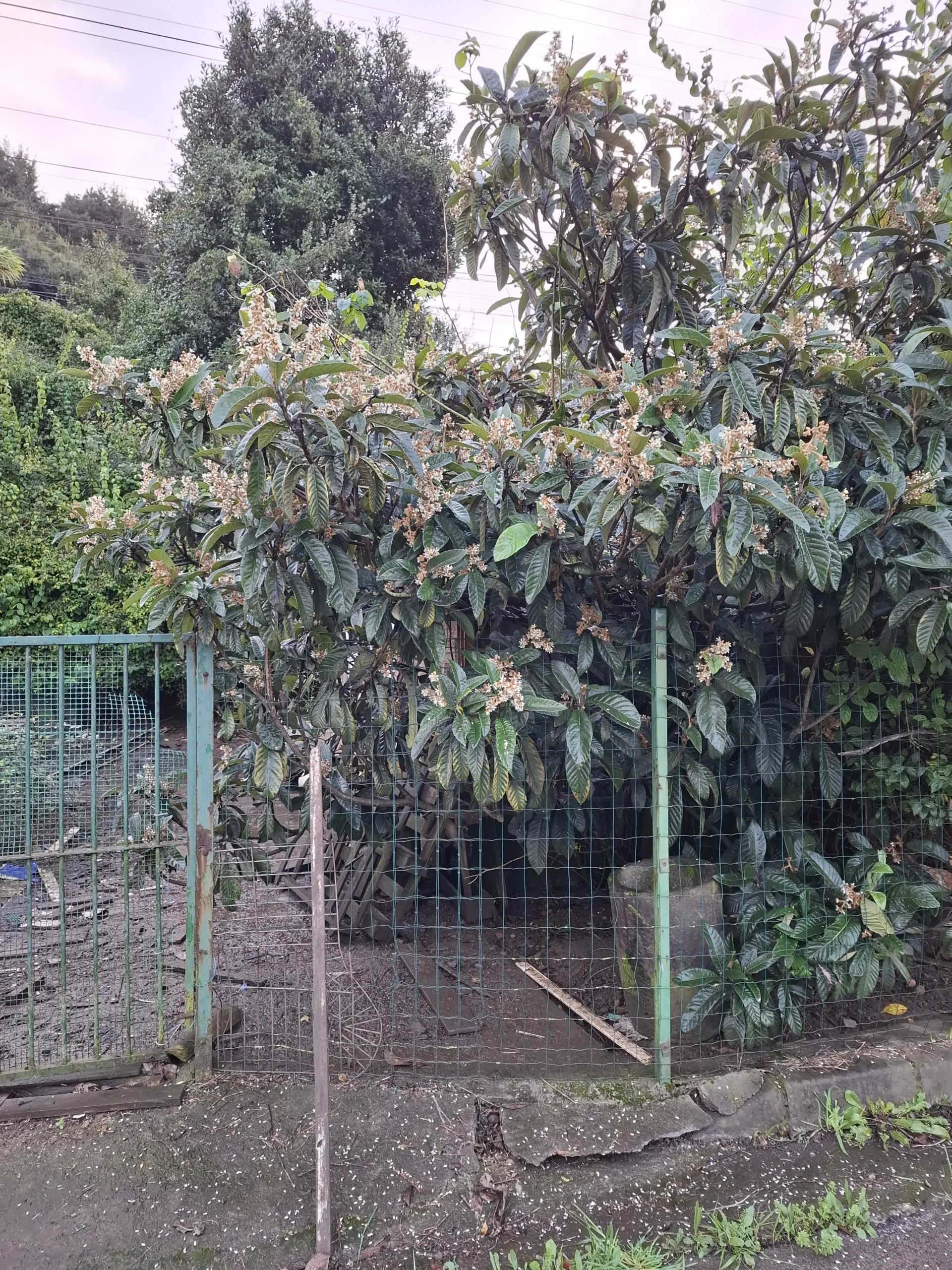 Ke svému překvapení za drátěným plotem vidím dalšího exota -lokvát japonský. Kvete naplno na podzim a jedlé plody dává na jaře. Květy krásně voní, ale přes slepičince nic necítím. U nás vymrzá, takže maximálně do květníku. Kde se ten tady vzal?