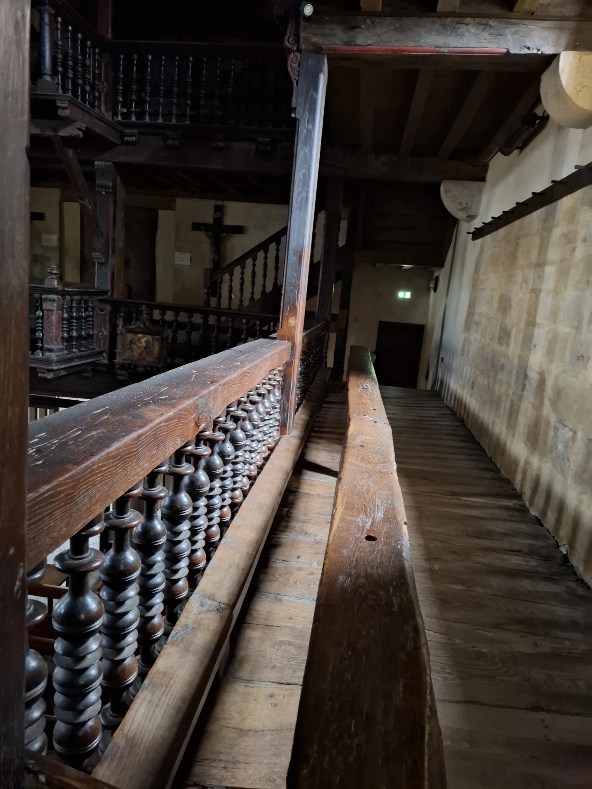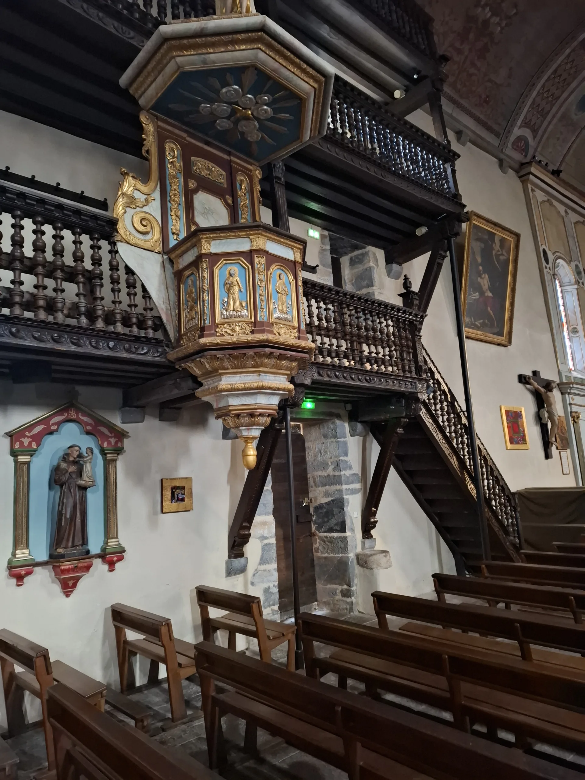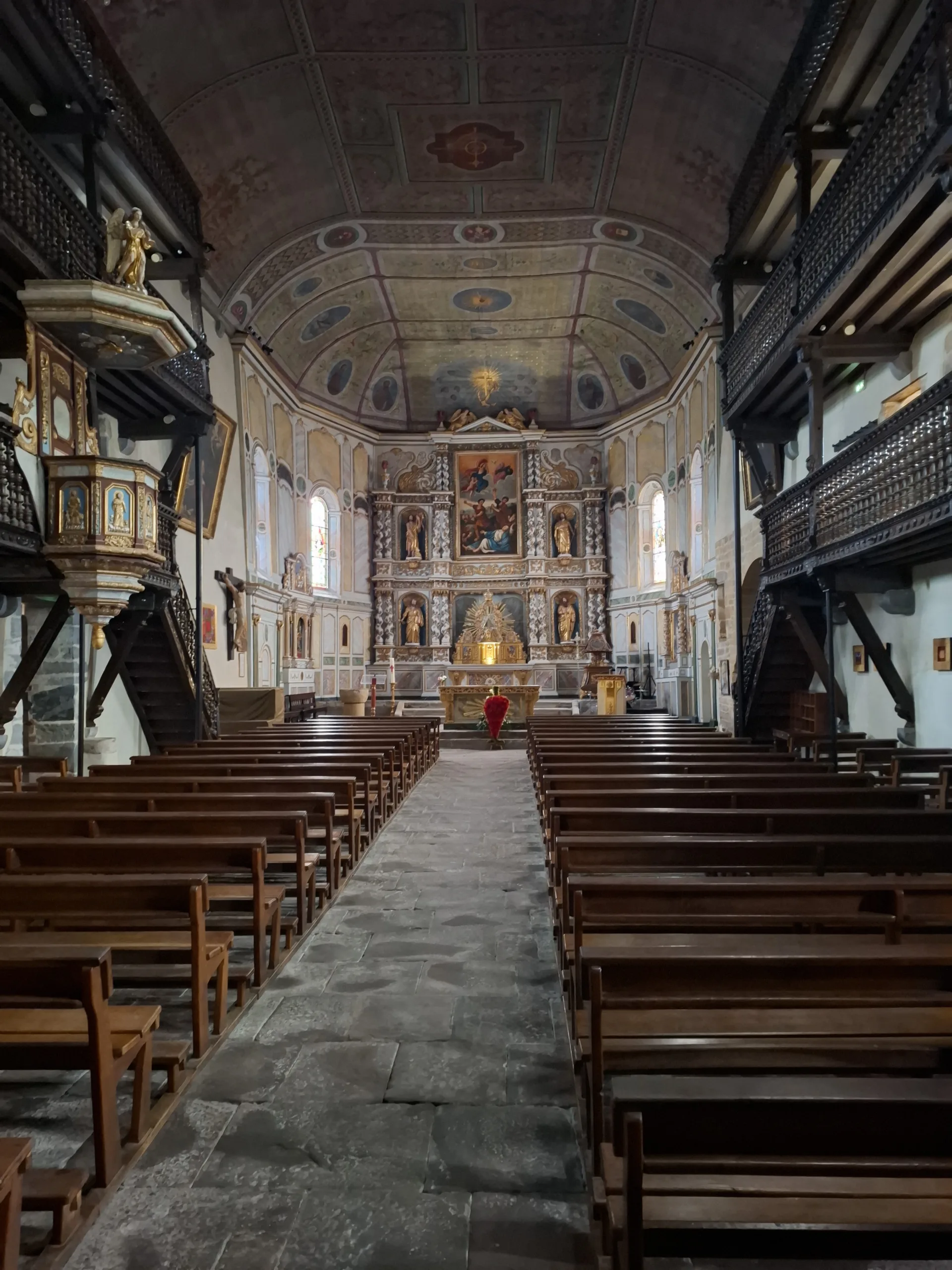 Jdu si už v klídku sednout do kostela Sv. Štěpána (Saint Etiene). Krásný baskický kostel s dřevěnými galeriemi pro muže. Malovaný strop a nádherný oltář od podlahy až ke stropu. A u něj – souprava bicích a klávesy ve futrále.