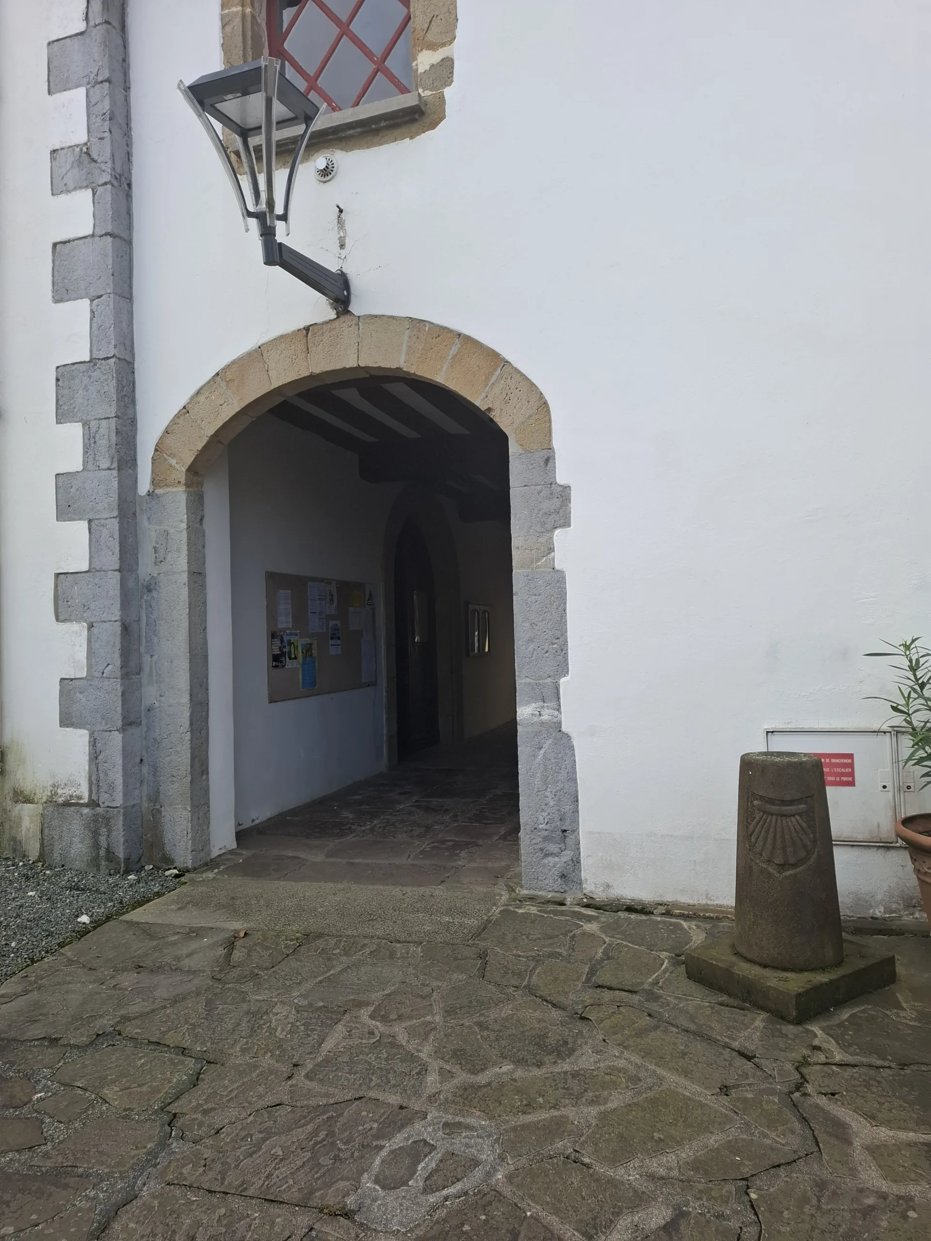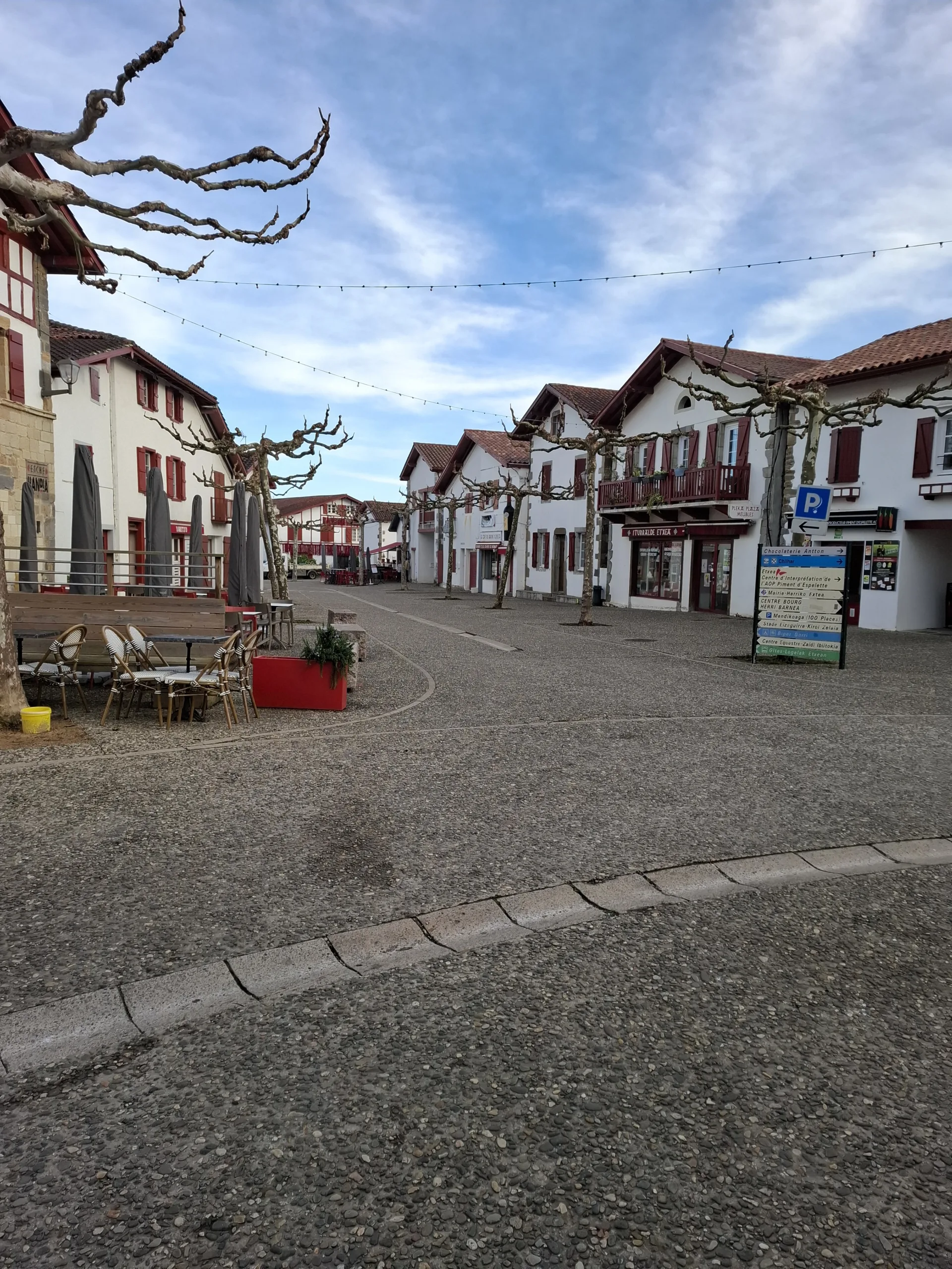Zaskočím ještě pro razítko do infocentra na radnici a pomalu procházím městečkem. Všechny domy ve stejné barevnosti -bílá omítka, kamenná ostění dveří a oken, tmavě rudé okenice a střechy. Krámy všechny užitečné – řeznictví, prodej drůbeže, vinotéky, sýrárny a papriky, papriky, papriky. Žádné hadrárny jako u nás. Názvy obchodů v baskičtině a francouštině.