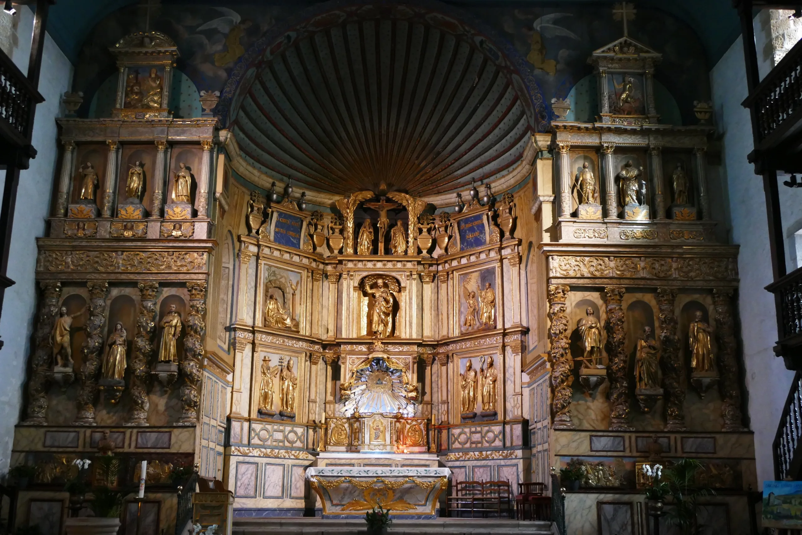 Místo bezhlavého svatého jako Cambo les Bains krásná Madona ve zlatém rouchu, před stolem Páně obrovské červené květinové srdce. Na dálku vypadalo jako z červených papriček. Tenhle kostel žije.