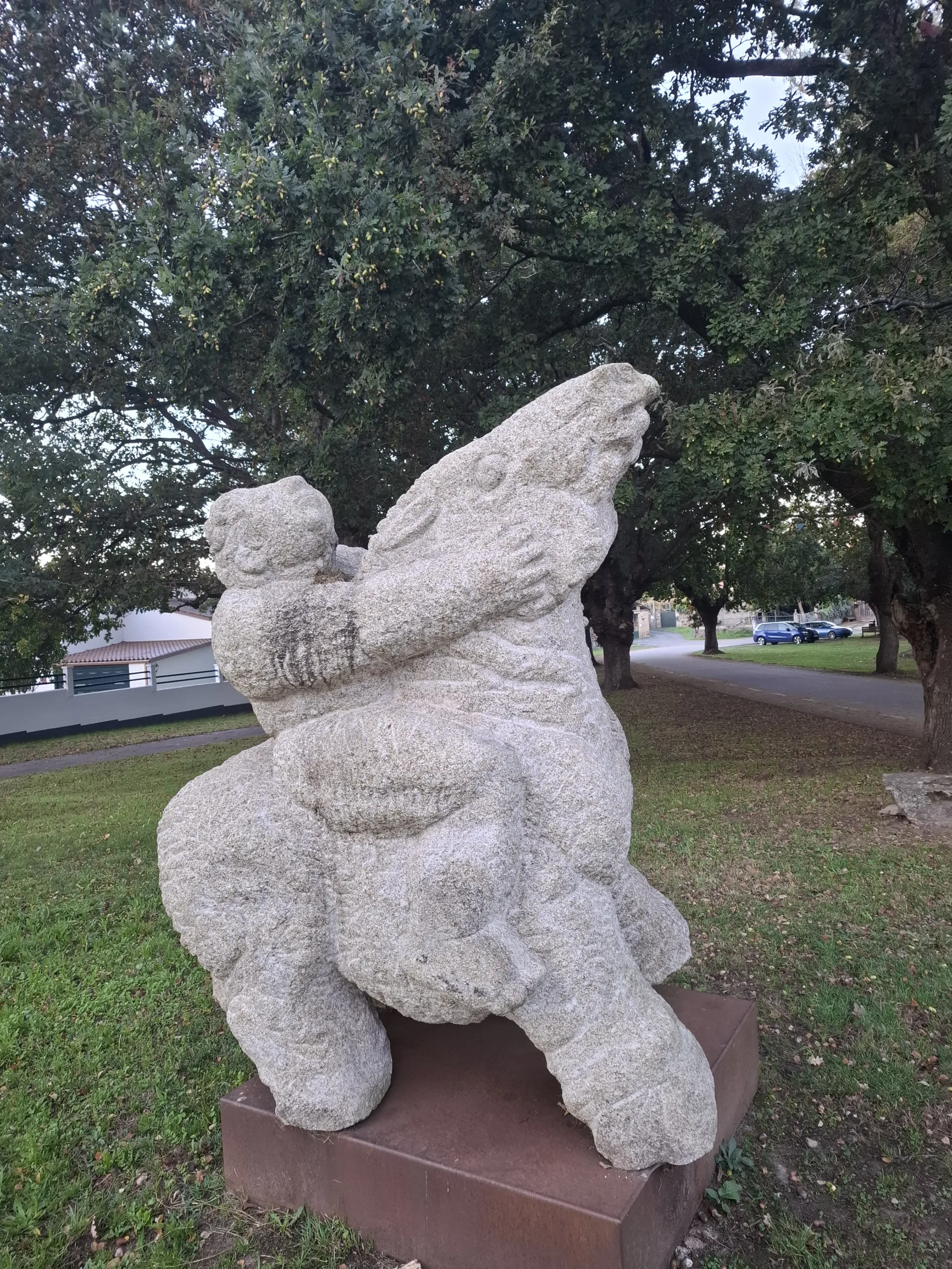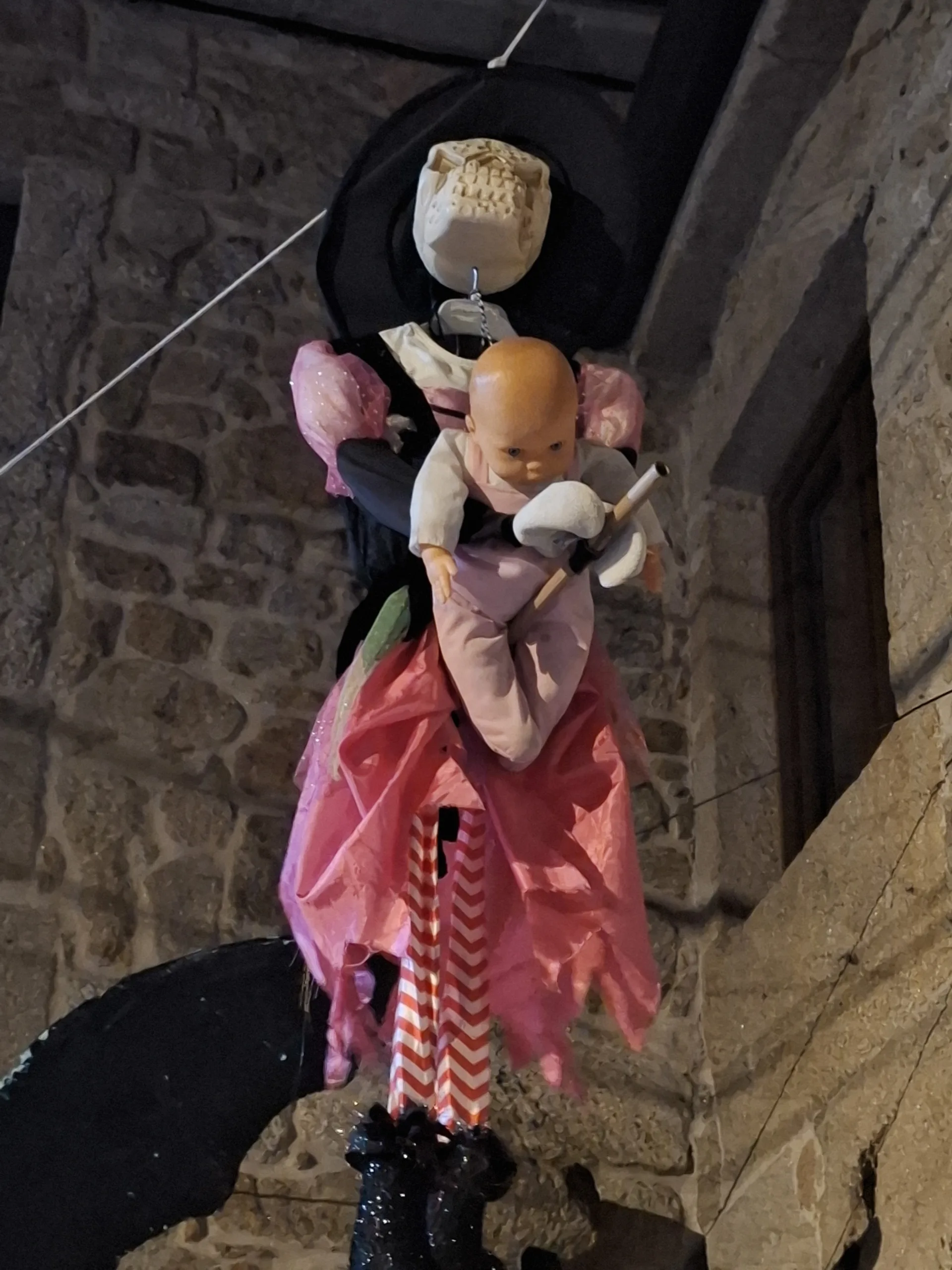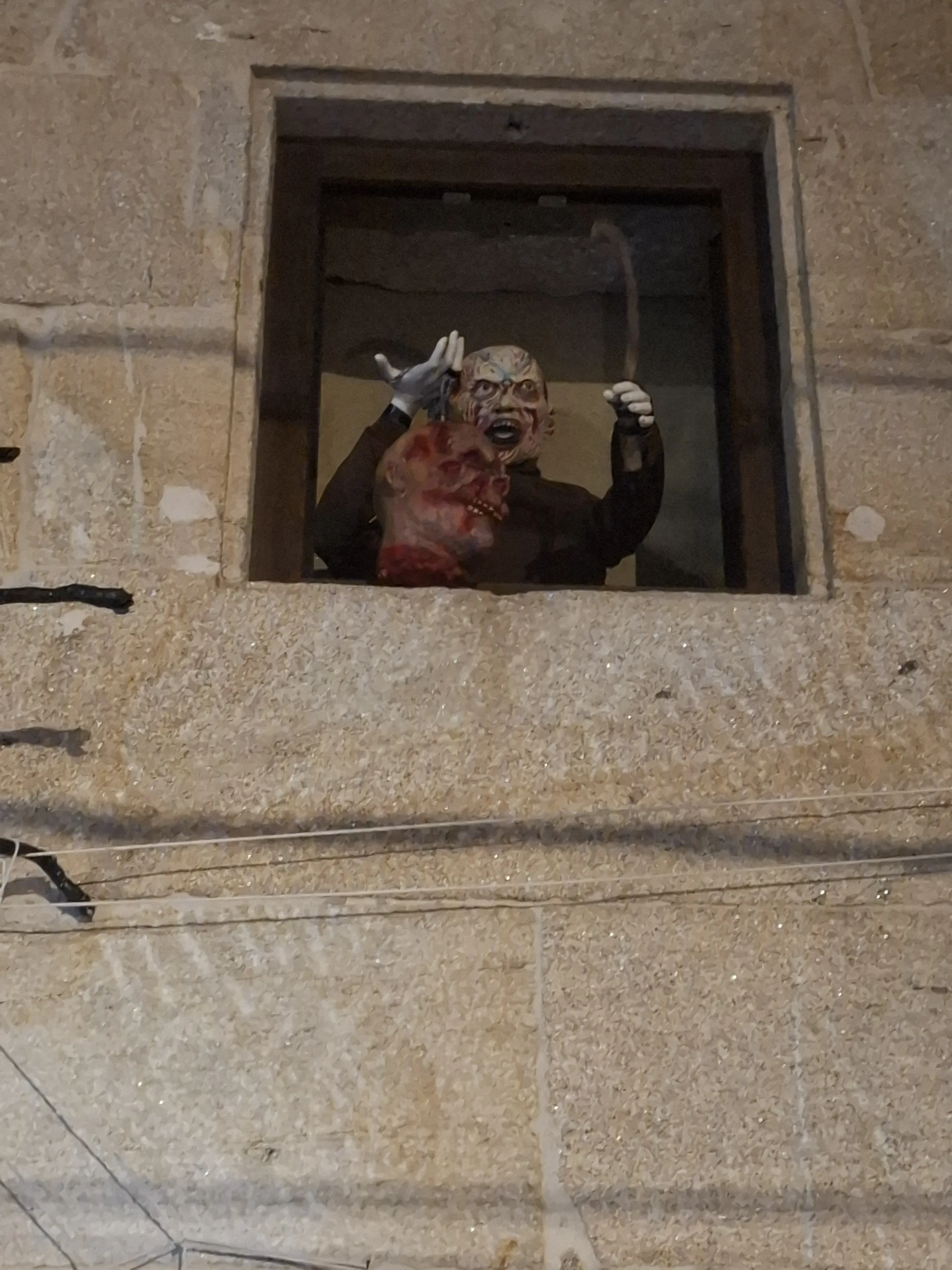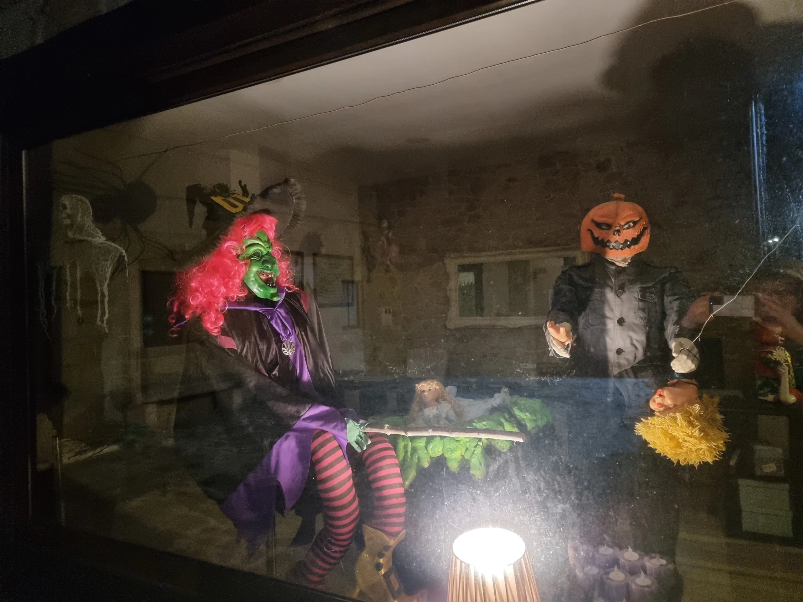Po dvou kilometrech se napojujeme na hlavní silnici v Escravitude. Městečko zdá se spí, ale přes temná okna nás pozorují nějaké divné postavy. Jeptiška v hábitu, ale nějaká zakrvácená? A tady po baráku leze ohromný pavouk. No a tady -čarodějnice vaří v kotlíku děťátko! Naturalistická příprava na Halloween nám skoro nahání husí kůži.