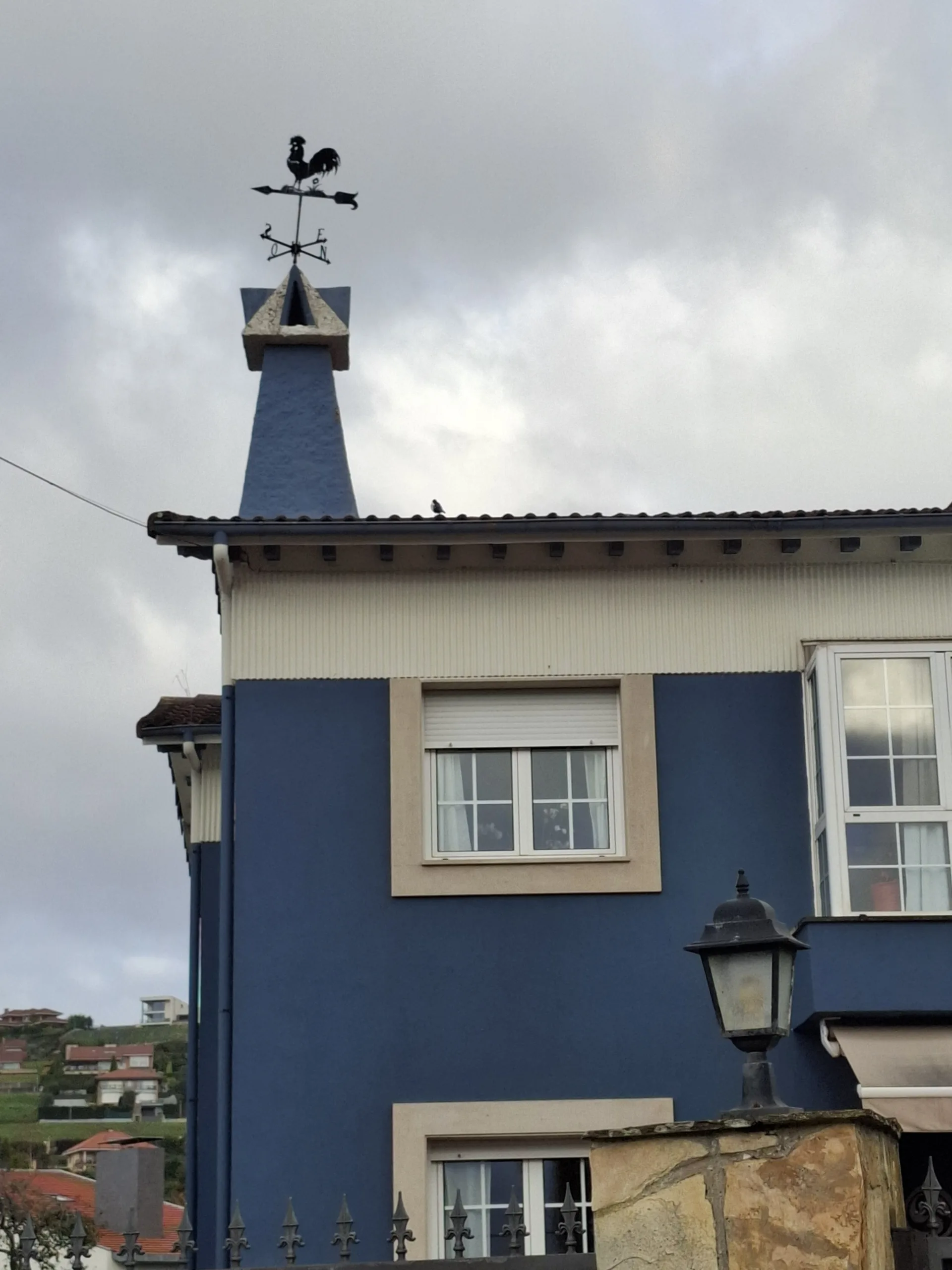 Přejdu přes dva kopce a už pod sebou vidím Gijon. Ještě si dám razítečko u krásného zastřešeného stolečku poblíž pár domečků. Nad ním vlaje asturská bleděmodrá vlajka se zlatým asturským křížem a za ním jabloň s jablky na sidra. Všechny symboly Asturie pohromadě!