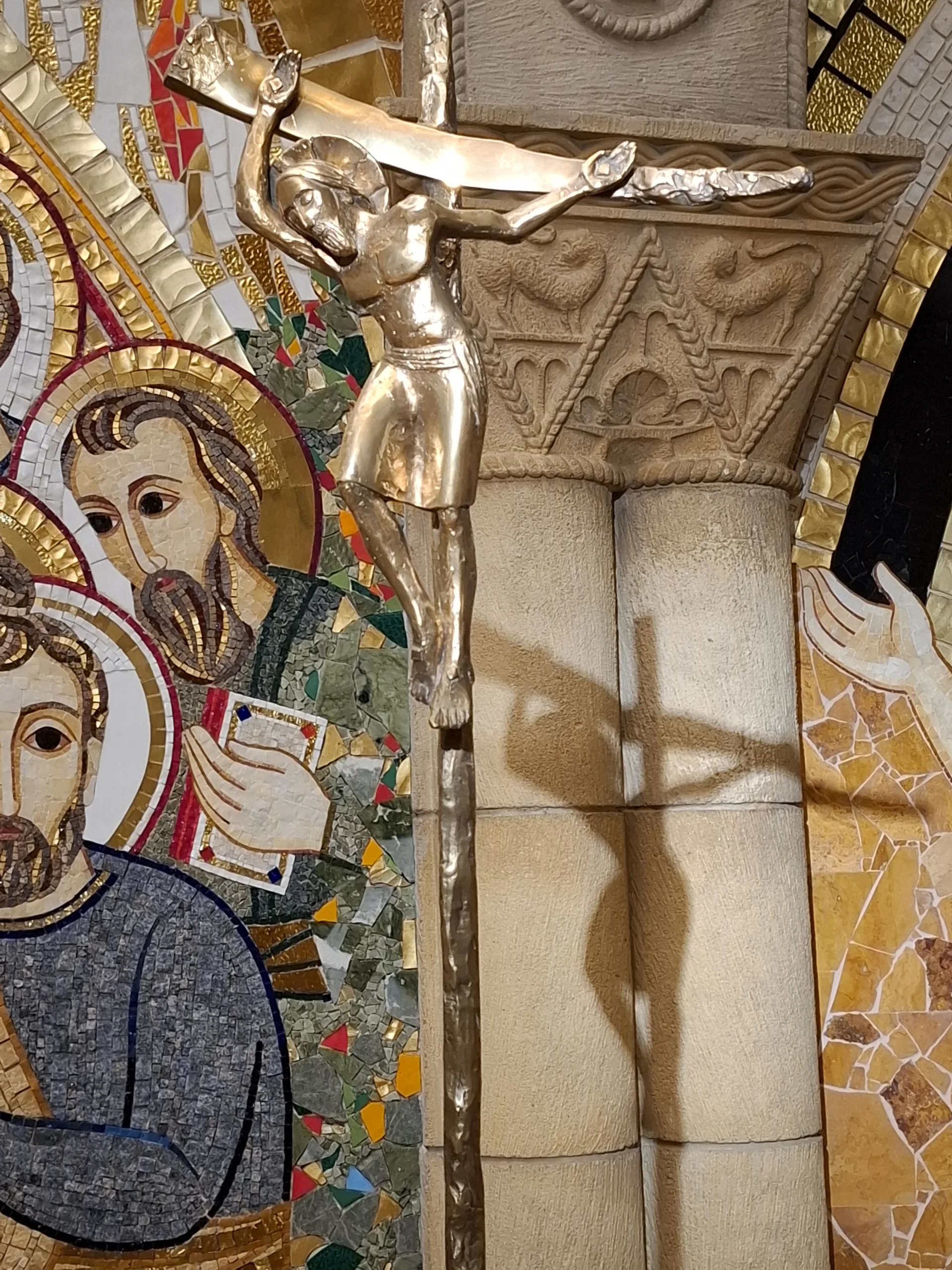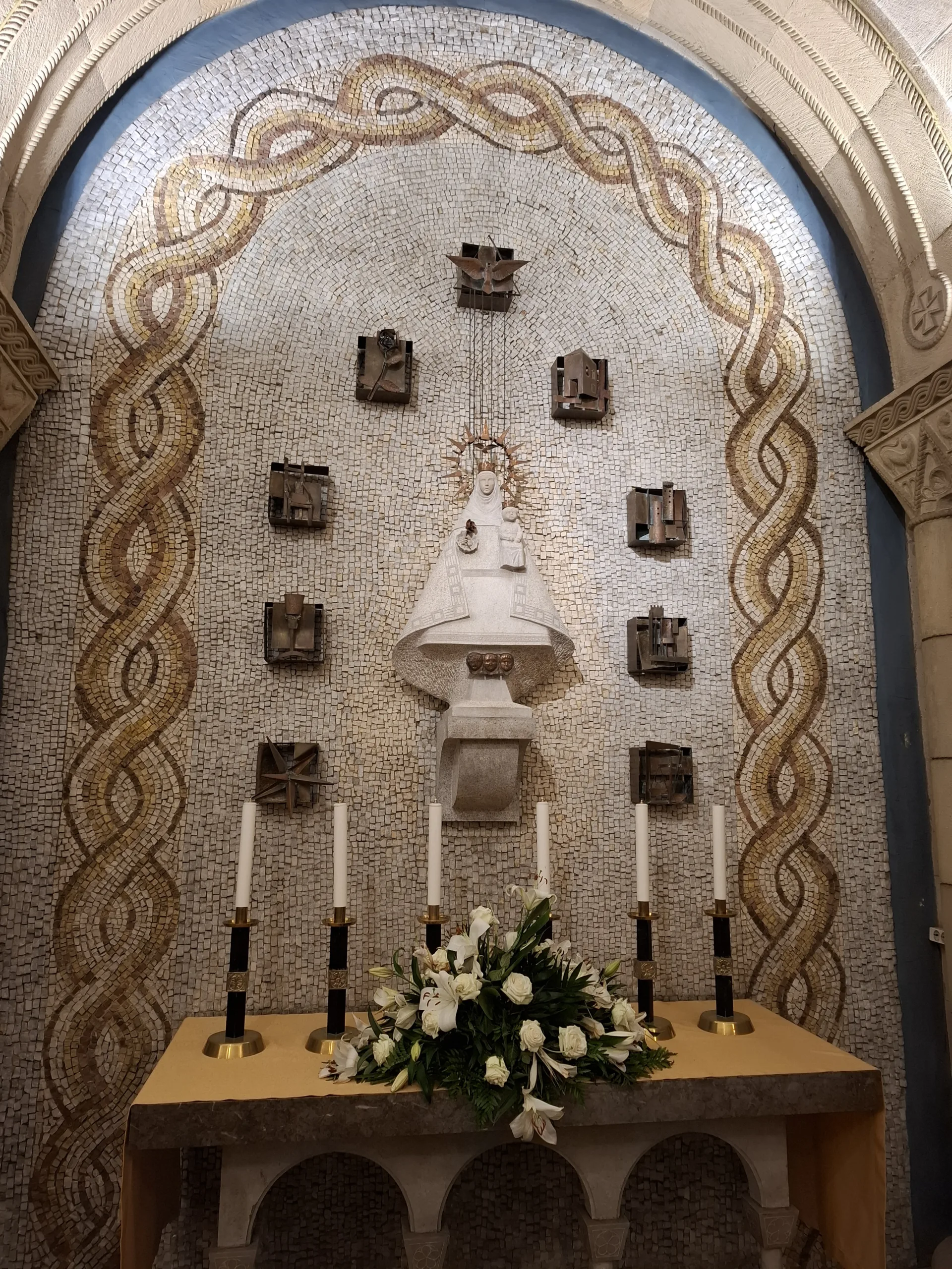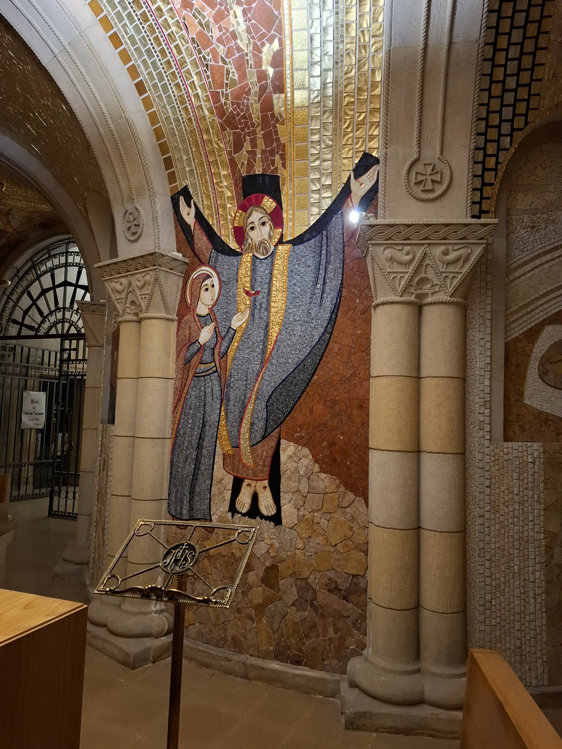 Nalevo do vchodu už připravují jesličky a vánoční výzdobu. Jdu si nejdřív posedět a poděkovat, ale bušení kladiv a vrtání moc soustředění nepodporují. Obcházím kostel a obdivuji nádherné mozaiky. Navrhl je Marko Rupnik, Slovinec, který se podílel i na výzdobě českých kostelů. Nedávno se na něj provalilo obtěžování jeptišek, kterého se měl jako mladík dopustit, ale ještě není nic uzavřeno. Zlaté mozaiky jsou ale nádherné. Vůbec v celém kostele se prolíná staré s novým, protože byl dost poničen za občanské války.