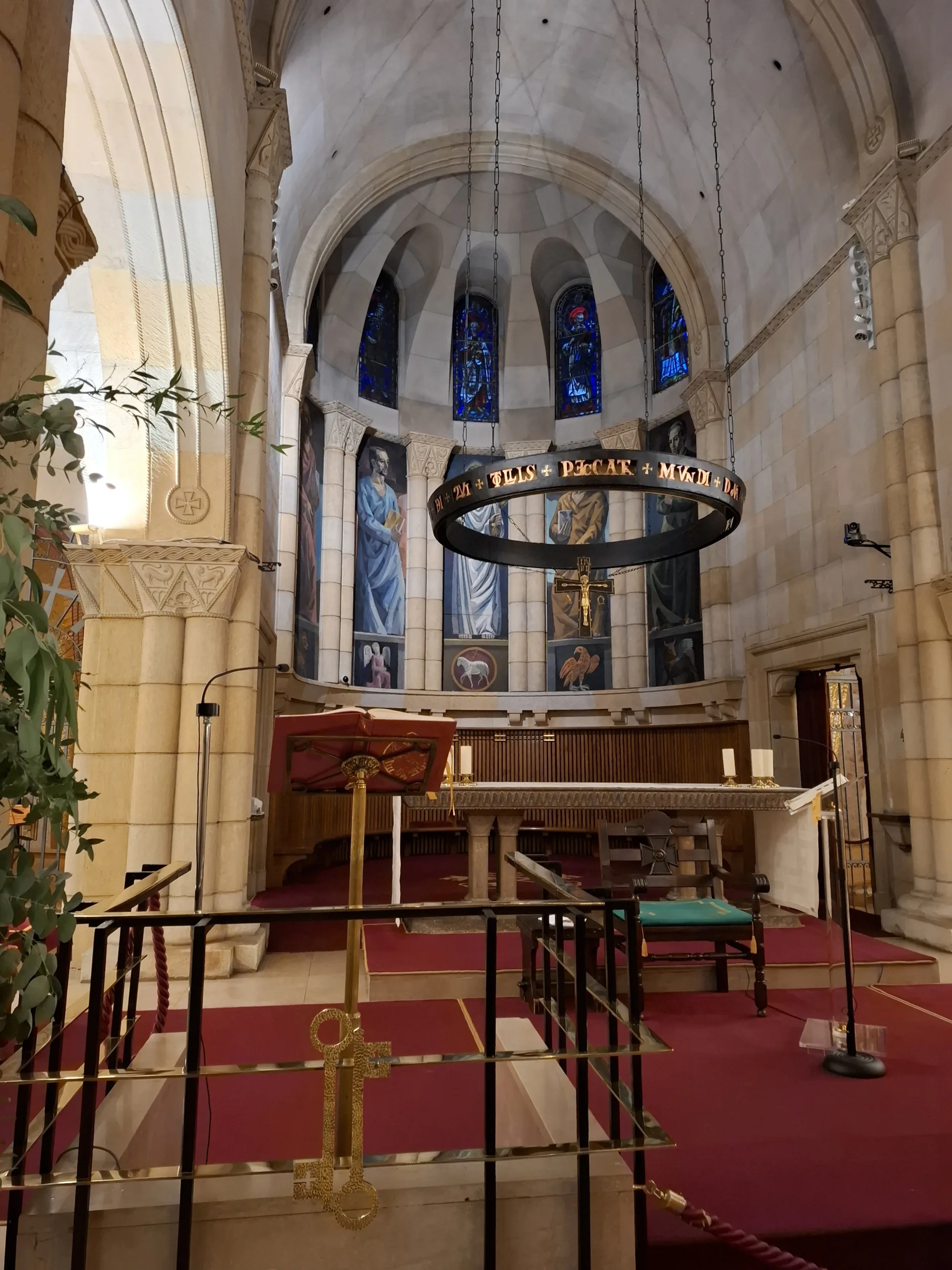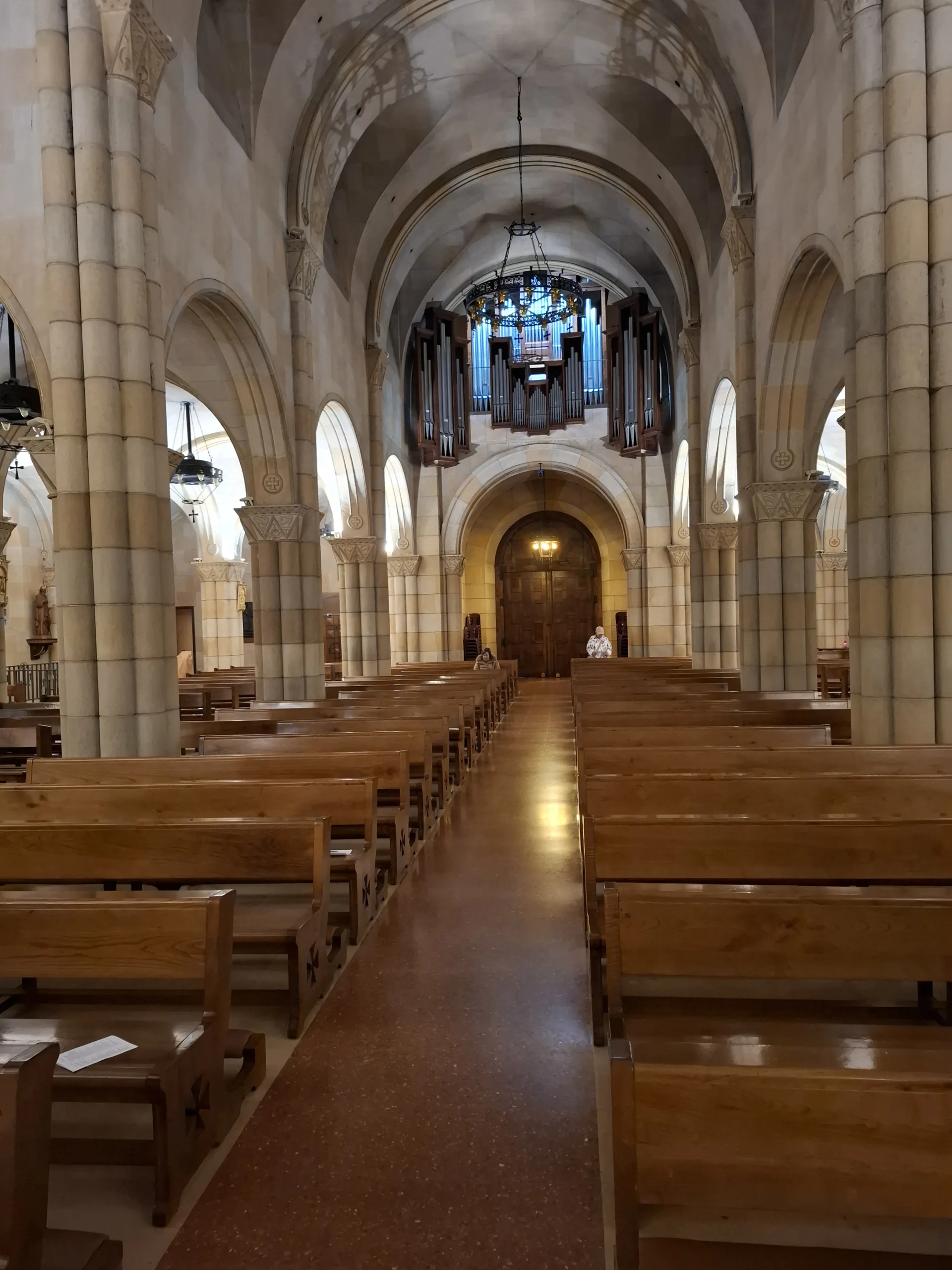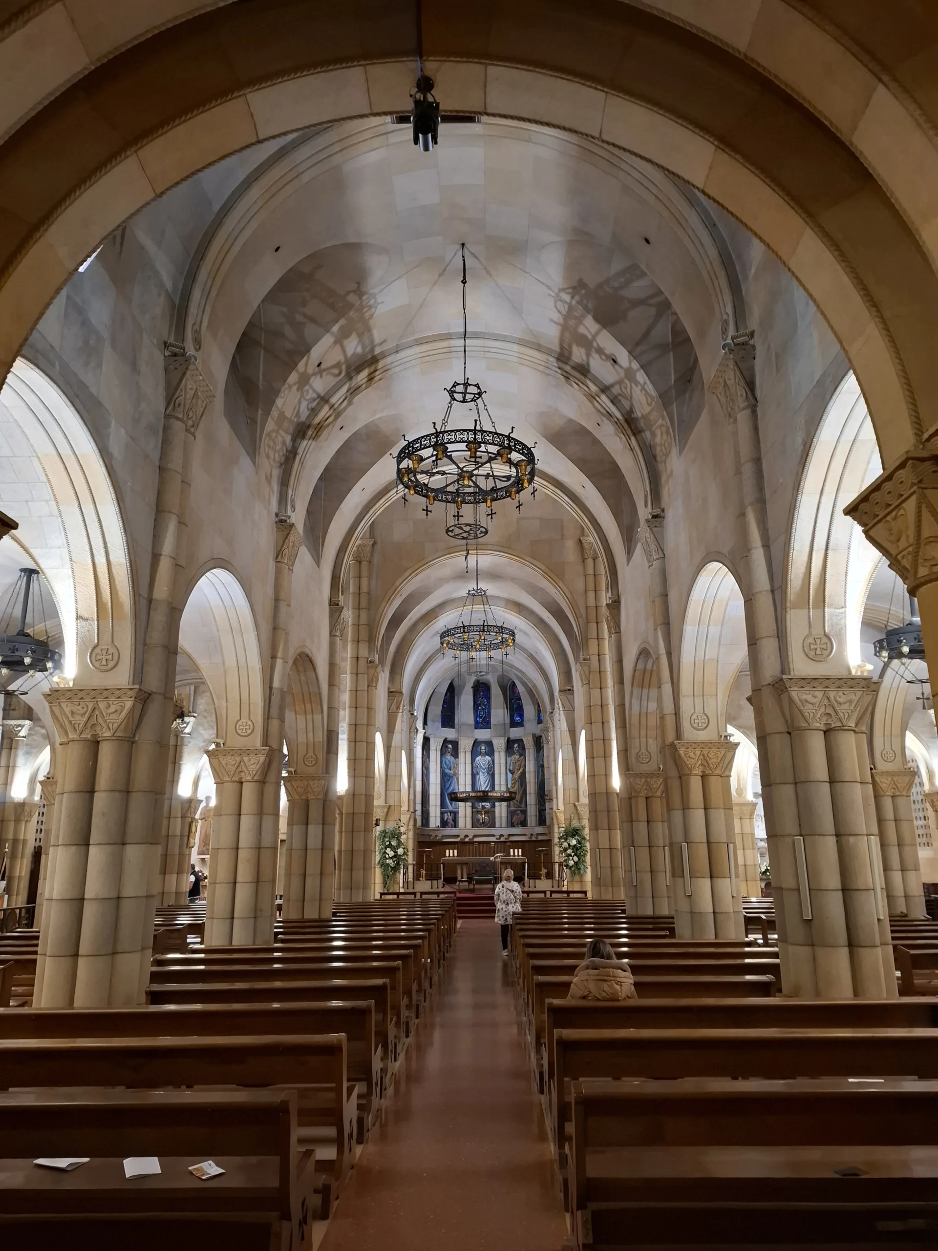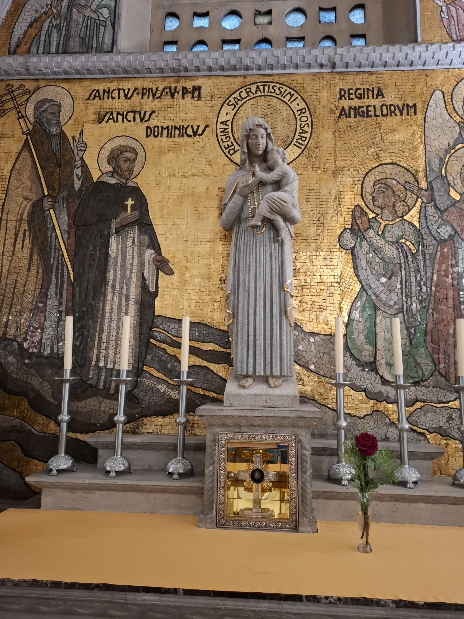 Nalevo do vchodu už připravují jesličky a vánoční výzdobu. Jdu si nejdřív posedět a poděkovat, ale bušení kladiv a vrtání moc soustředění nepodporují. Obcházím kostel a obdivuji nádherné mozaiky. Navrhl je Marko Rupnik, Slovinec, který se podílel i na výzdobě českých kostelů. Nedávno se na něj provalilo obtěžování jeptišek, kterého se měl jako mladík dopustit, ale ještě není nic uzavřeno. Zlaté mozaiky jsou ale nádherné. Vůbec v celém kostele se prolíná staré s novým, protože byl dost poničen za občanské války.