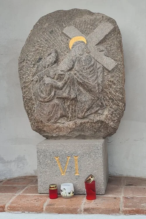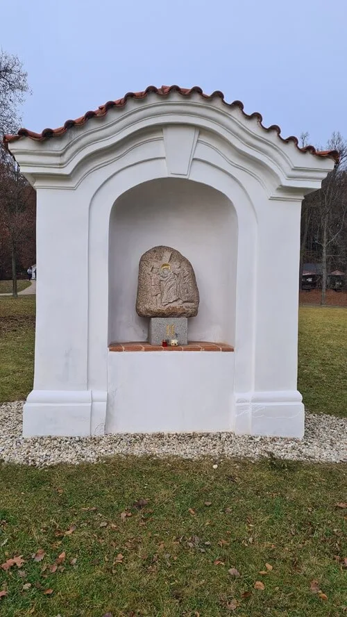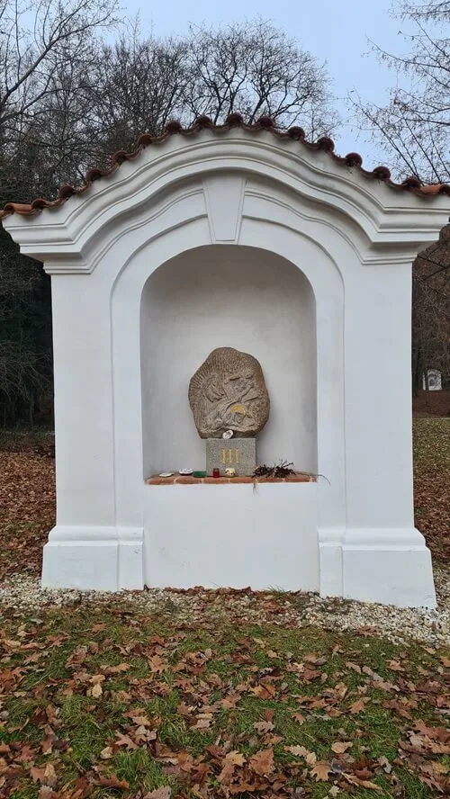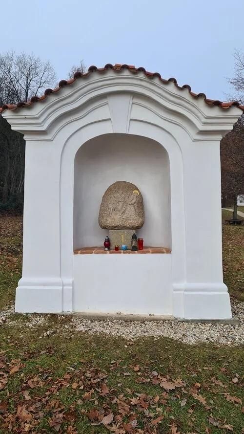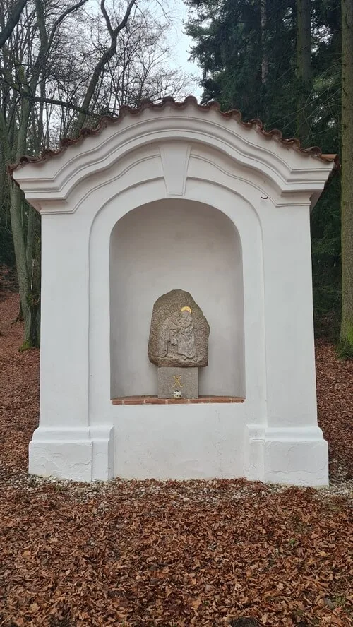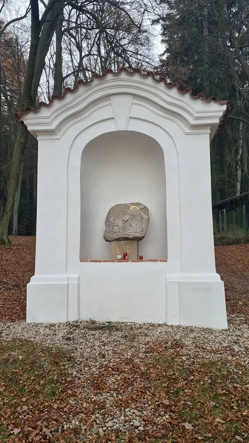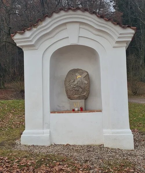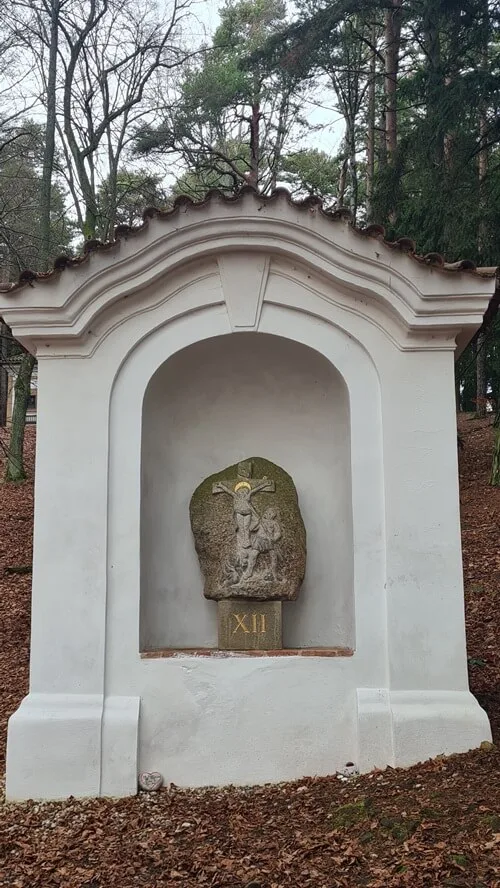 Strategická informace – najdete ho napravo od kostelíky S. Máří Magdaleny v dřevěné schránce s jasně žlutou svatojakubskou mušlí.