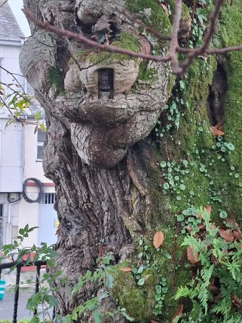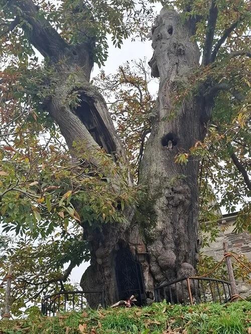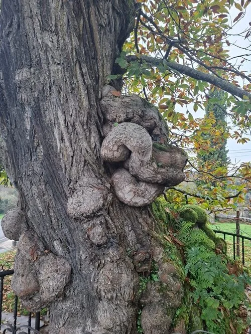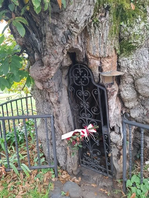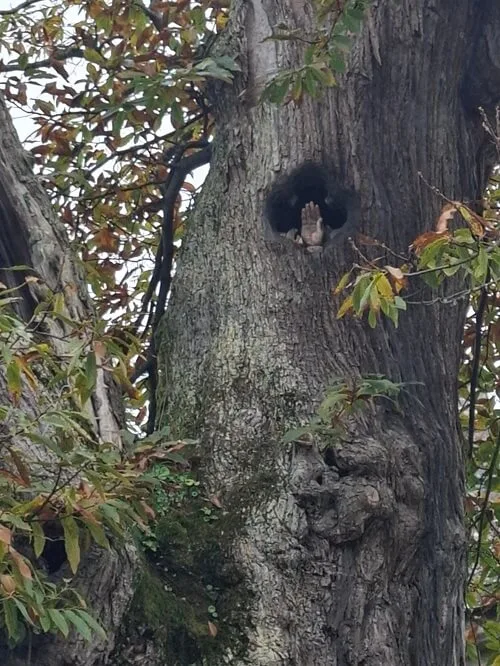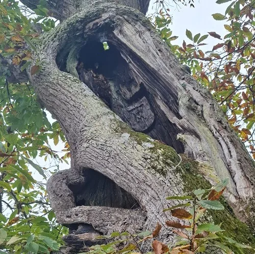 Do dalších děr někdo vyřezal různé svaté, městský znak a tady dokonce kouká z díry ruka! Jako památný strom ho ukazují i mapy.cz, takže unikát. Dokonce jsem pod ním našel pár letošních kaštanů.