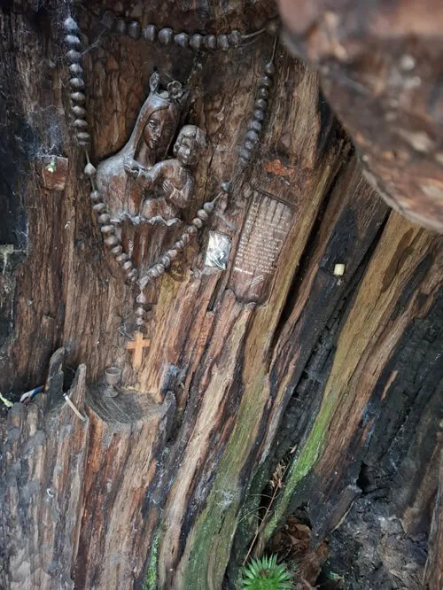 Krásný areálek s kaplí Sv Alberta a křížem hned za mostem přes řeku Parga. Schovaný v lese, pečlivě udržovaný, otevřený přes léto. Teď akorát mohu obdivovat zelený mech na hlavě madony na kříži. Dělá jí krásnou čepičku a spokojeně se usmívá, že jí teplo na hlavičku.