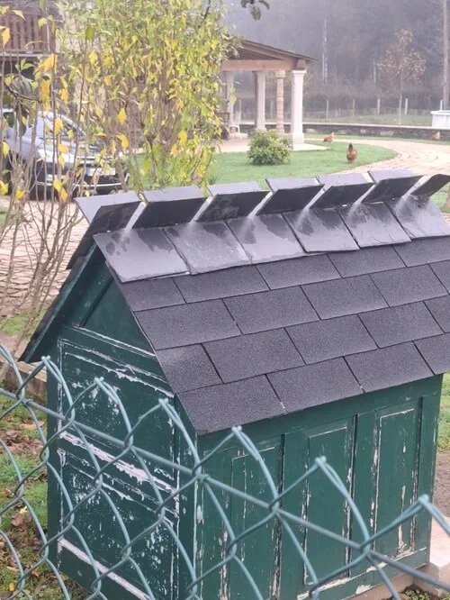 V další vesnici se někdo prachatý snaží zapadnout a tak má nápodobu břidlicových šablon i na psí boudě. Zubatý hřeben mu pokrývač udělal z plechových šablon. Sranda srovnání.