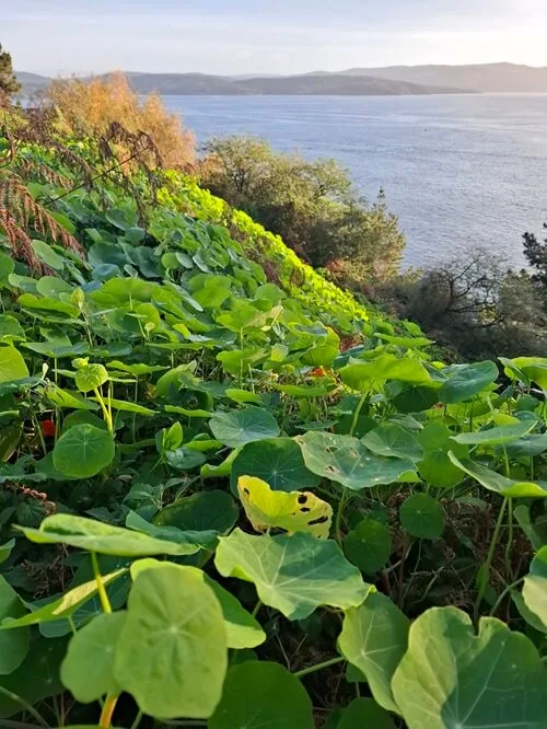 Před městečkem se ukáže stráň plná lichořeřišnice. Ve tmě nebyla vidět, tak si dám ranní salát. V tom ke mě dochází japonský poutník celý zabalený do ponča a teplého prádla. Pravda, fouká mírný větřík, ale tohle mi přijde už přehnané. On se zase otřepe zimou nad mým tričkem a kraťasy. Sranda, jedno Camino a tolik přístupů.