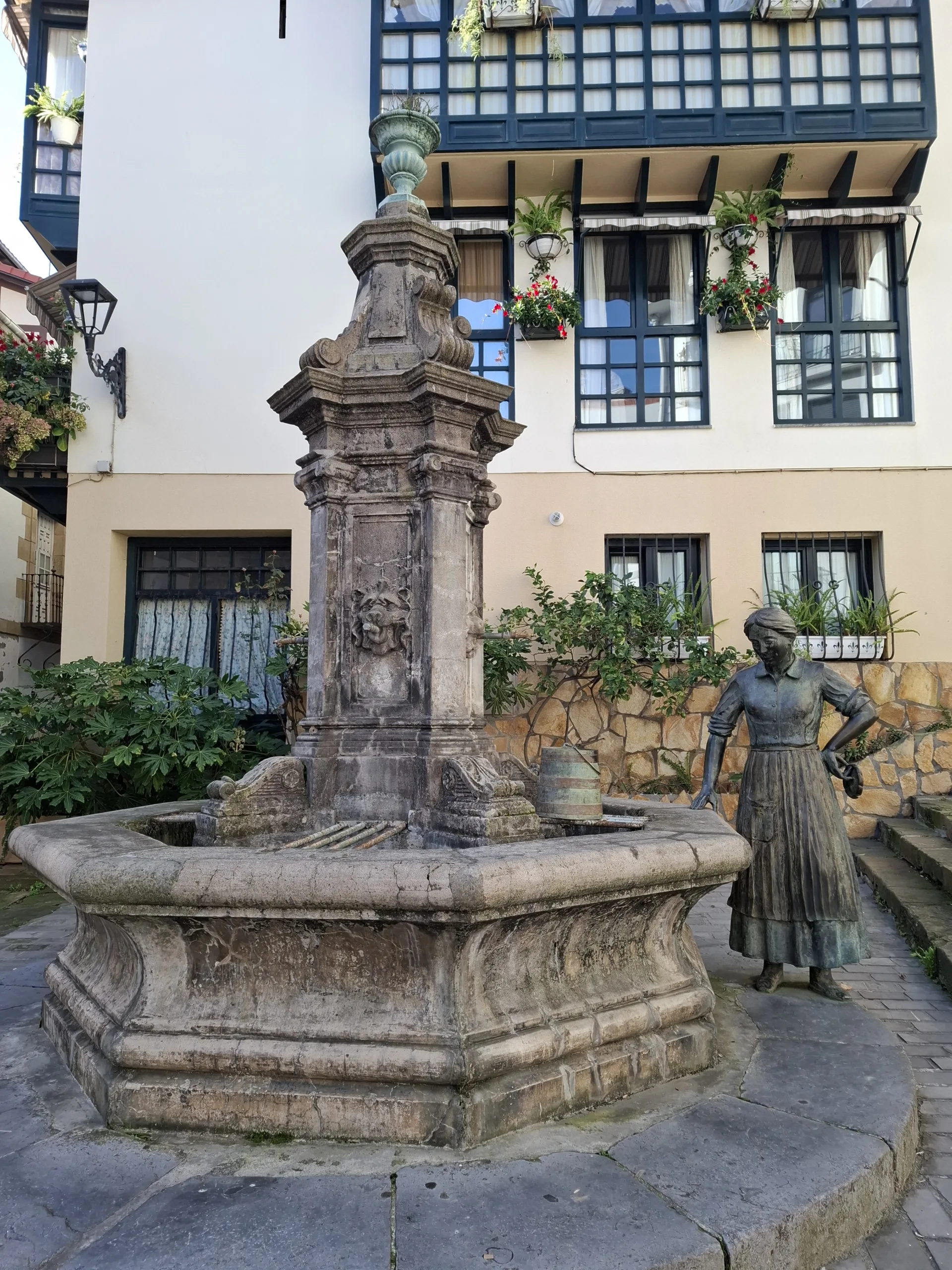 Obejdu kotviště jachet, přes mostek a otevřené Oficina de turismo. Paní bouchne razítko, zapíše si dalšího Čecha do statistik a pokračuji kolem kašny, kde stále ještě čeká bronzová hospodyňka, až jí nateče plné vědro vody. Ruku v bok, druhou se opírá o kašnua myslí si na svoje věci.