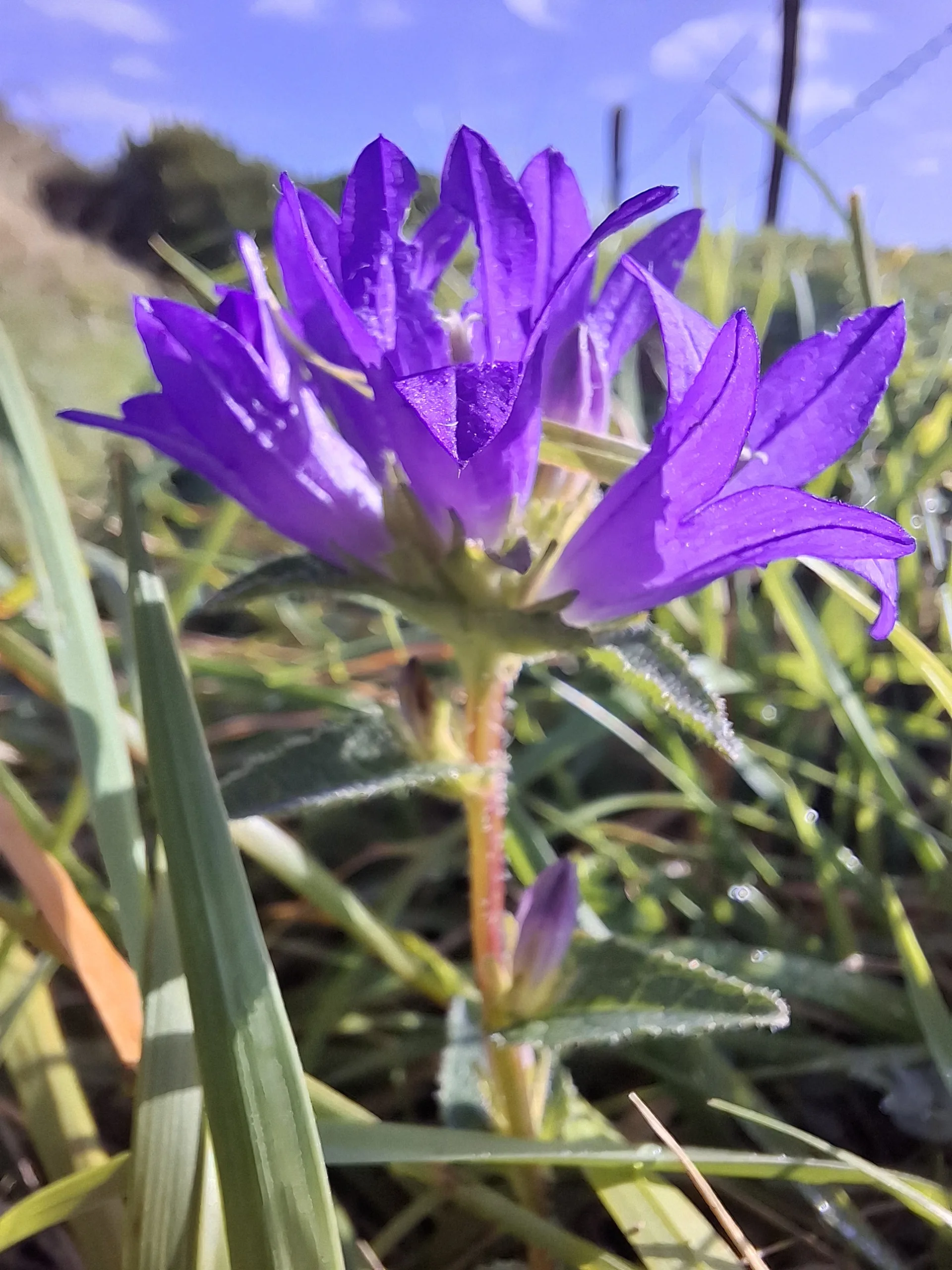 Zarautz procházím kus po pláži, pak kolem krásné zvonice a už funím do prvního kopce. Ty výšlapy jsou brutální -rovinka, rovinka, pak tři sta metrů skoro kolmo nahoru a zase rovinka po hřebeni. Výhledy jsou úžasné. Doprava na moře, vlevo vnitrozemské kopečky a bílá kulatá vyhlídka Vista Alegreko Torreoia. Vinice, keře s krásnými modrými nebo bílými květy.