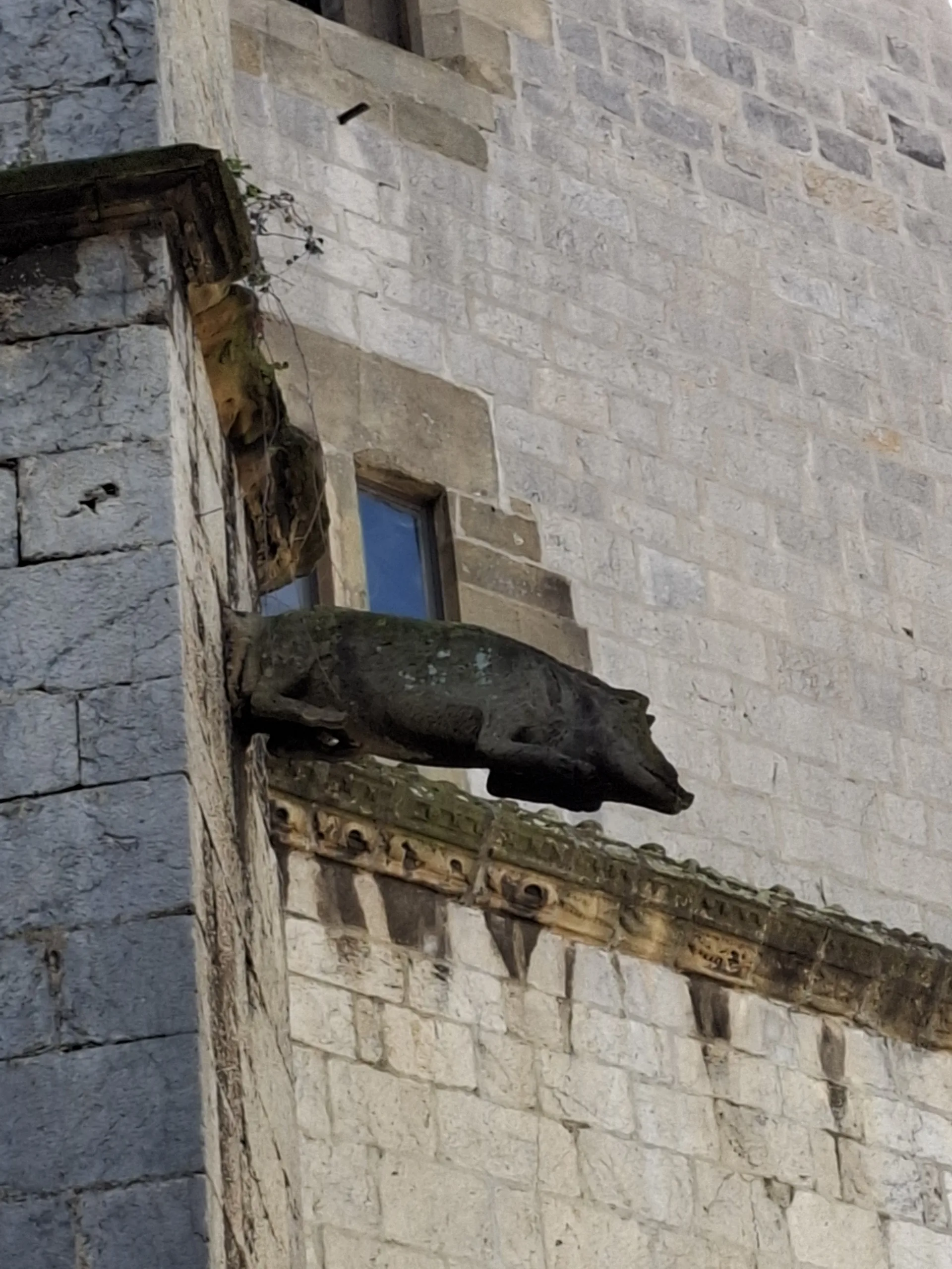 Krásný špek na mě kouká z rohu pod oknem – chrlič ve tvaru prasete! Srandista sochař.